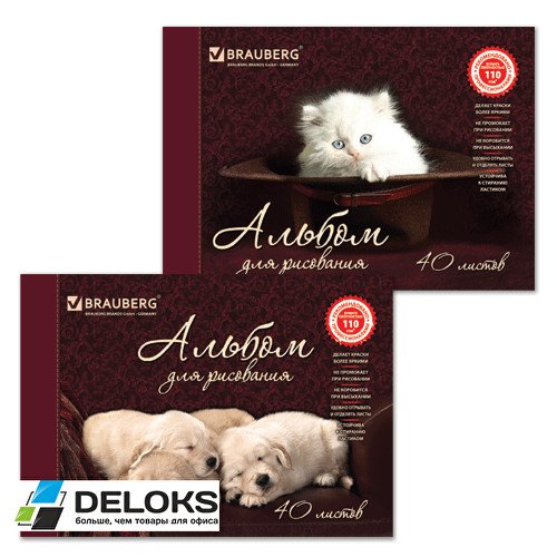 Альбом для рисования, 40 л., BRAUBERG, на завязках, обложка мелованный картон, 110 г/м2, «Котенок/щенок», 2 вида