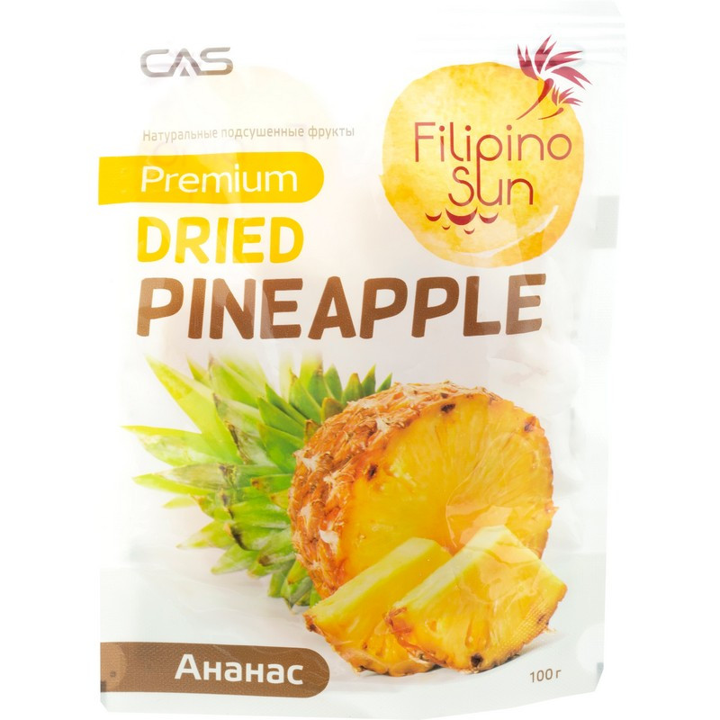 Ананас Filipino Sun сушеный 100 г — это природный энергетик, дарящий необыкновенный прилив бодрости и хорошего настроения, содержащий комплекс витаминов, минералов, кислот и микроэлементов. Состав: отборные плоды ананаса, сахар, пиросульфит натрия. Вес: 100 г. Тип упаковки: мягкая. Пищевая ценность на 100 г продукта: белки — 1 г, жиры — 0 г, углеводы — 93 г. Энергетическая ценность на 100 г продукта: 325ккал. Условия хранения: в сухом прохладном месте, при температуре от 5 до 25 °C, после открытия хранить в холодильнике и употребить в течение 1 месяца. Срок годности: 24 месяцев. Страна производства: Филиппины.