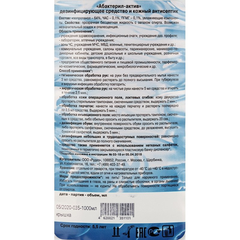 Антисептик кожный «Абактерил Актив» спиртовой 1 л. Химический состав средства: ЧАС, гуанидин, спирты, вспомогательные компоненты. Действующие вещества: алкилдиметилбензиламмоний хлорид (АДБАХ) 0.1%, изопропиловый спирт (пропанол-2) 64%, компоненты, улучающие состояние кожи, полигексаметиленгуанидин гидрохлорид (ПГМГ) 0.1%. Сфера применения: акушерские стационары, ЛПУ, клинические лаборатории, станции переливания крови, бактериологические лаборатории, детские учреждения (детсады, школы и т. п. ), пенитенциарные учреждения, инфекционные очаги, предприятия общественного питания, потребительские рынки, коммунальные объекты (бани, бассейны, гостиницы, общественные туалеты и т. п. ), учреждения соцобеспечения, парикмахерские, косметические и массажные салоны, санитарный транспорт, отделения неонатологии, в быту населением, аптеки, учреждения культуры, отдыха (кинотеатры, музеи, театры), спортивные и культурно-оздоровительные комплексы, объекты курортологии, диагностические лаборатории, вирусологические лаборатории. Объекты обработки: гигиеническая обработка рук, жесткая мебель, кресла гинекологические, стоматологические, обработка инъекционного поля, обработка локтевых сгибов доноров, обработка операционного поля, обработка рук операционных медицинских сестер, акушерок и других лиц, участвующих в операциях и приеме родов, обработка рук хирургов, обувь, перчатки (из каучука, латекса, неопрена и т. д. ), поверхности в помещениях, поверхности приборов и аппаратов, предметы обстановки, резиновые и полипропиленовые коврики, транспорт для перевозки пищевых продуктов. Класс опасности: при введении в желудок — 4; при нанесении на кожу — 4; рабочего раствора — 4. Активно в отношении: бактерии (Mycobacterium tuberculosi, возбудители ВБИ, грамотрицательные бактерии, грамположительные бактерии), вирусы (атипичной пневмонии, ВИЧ, герпеса, грипп, парентеральных гепатитов, полиомиелит, птичьего гриппа (H5N1), свиной грипп (H1N1), энтеральных гепатитов), патогенные грибы (дерматофитон, кандида). Особые свойства: обладает пролонгированным антимикробным эффектом. Срок годности: 5 лет. Страна производства: Россия.