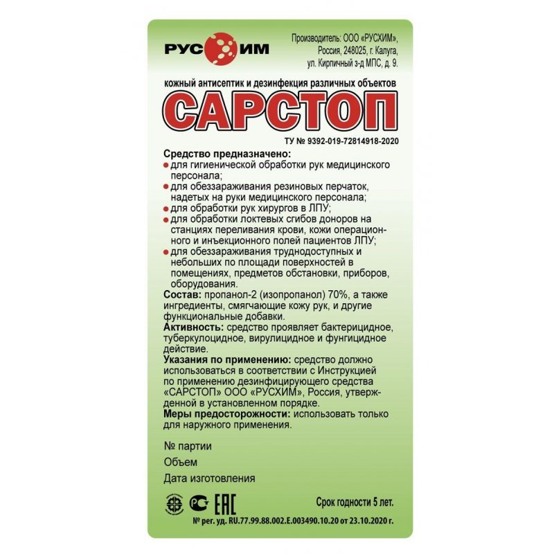 Кожный антисептик «Сарстоп» это высокоэффективное средство в виде бесцветного прозрачного раствора с содержанием изопропилового спирта в количестве 70%. Антисептик обладает мягким воздействием на кожу рук, рекомендован для использования врачами в медицинских учреждениях и соответствует всем требованиям Роспотребнадзора. Также может быть использован в бытовых целях и на предприятиях сферы обслуживания. Кожный антисептик «Сарстоп» максимально эффективен в отношении возбудителя Коронавируса (Covid-19), холеры, туберкулеза, всех видов гриппа, герпеса, ВИЧ, пневмонии и других инфекцийВ качестве действующих веществ содержит пропанол-2 (изопропанол) 70%, а также ингредиенты, смягчающие кожу рук, и другие функциональные добавки.