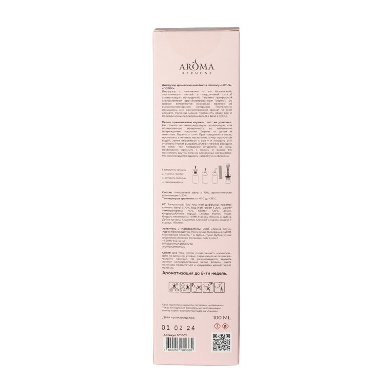 Дайте себе возможность расслабиться с ароматом Lotus, с лотосом в основе, который поможет найти внутреннюю гармонию и спокойствие, а ноты морской соли и зеленого чая деликатно дополнят картину. Диффузор ароматический Arona Harmony «Lotus». «Лотос». Ноты аромата: Лотос, морская соль, бергамот, зеленый чай Диффузор с палочками - это безопасный, экологически чистый и натуральный способ ароматизации помещения. Является прекрасной альтернативой ароматизированным спреям. Во флакон вставляются несколько палочек из высококапиллярного материала. Постепенно насыщаясь, они распространяют аромат по всей комнате. Палочки можно применять сразу все и периодически переворачивать (1-2 раза в сутки). Перед применением изучите текст на упаковке. Не ставить на незащищенную окрашенную или полированную поверхность, во избежание повреждения покрытия. Беречь от детей и животных. Беречь от огня. Не принимать внутрь. При попадании в глаза промывать в течение нескольких минут проточной водой. Затем обратиться к врачу и показать ему этикетку. Может вызывать аллергическую реакцию на коже. При попадании жидкости на кожу необходимо промыть с мылом и водой. Не принимать внутрь. Опасно для водных организмов. Не рекомендуется вдыхать напрямую из флакона. Состав: гликолевый эфир 70%, ароматическая композиция 20% Температура хранения: от +5С до +25С. Объем: 100 мл. Совет: для того, чтобы поддерживать уровень ароматизации на должном уровне, периодически переворачивайте палочки. Не рекомендуется вдыхать аромат непосредственно через флакон, дайте палочкам пропитаться и слушайте аромат через палочки. Номер партии соответствует дате производства на упаковке. Срок годности в закрытом состоянии неограничен. Товар не подлежит обязательной сертификации.