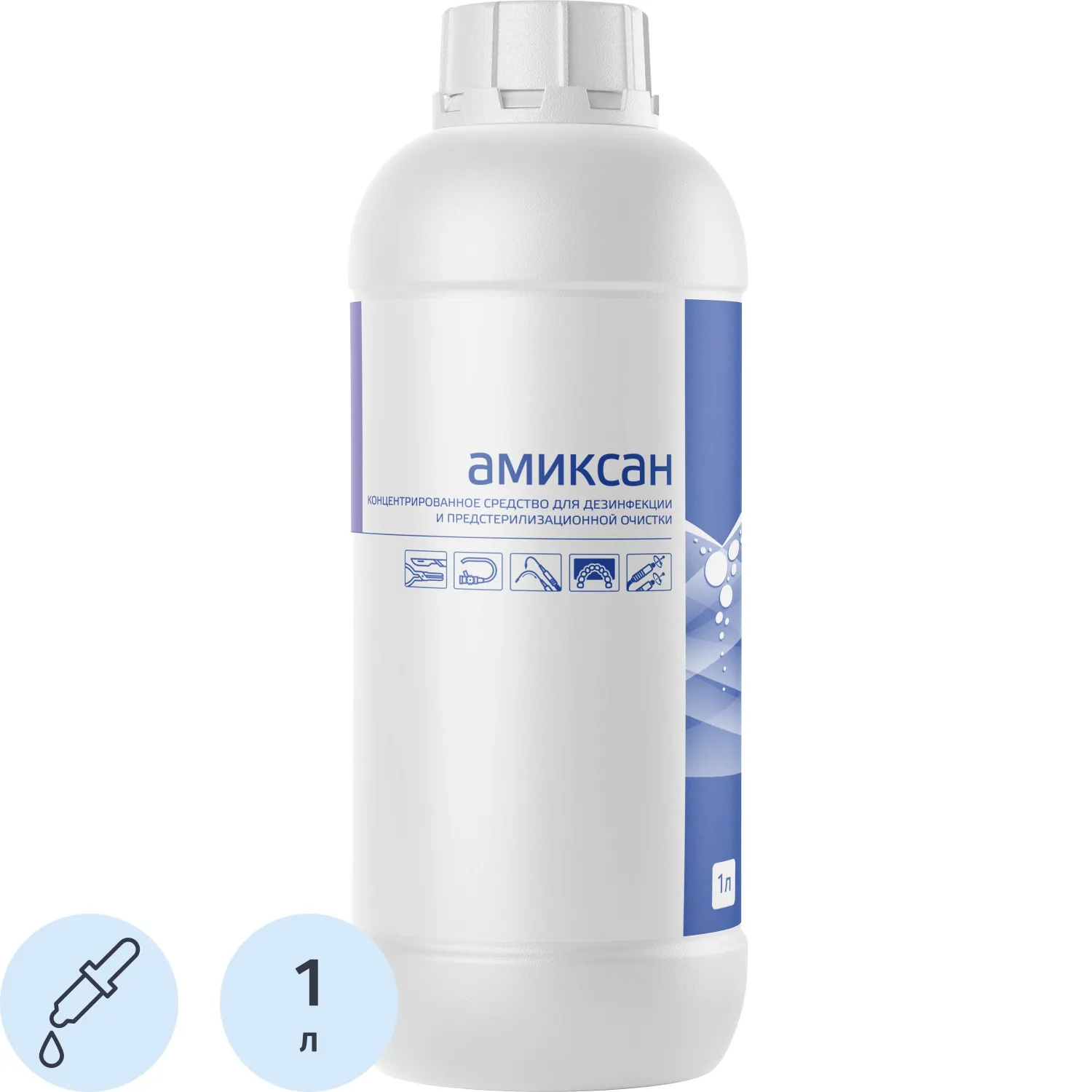 Дезинфицирующее средство предназначено для дезинфекции и предстерилизационной очистки медицинских изделий, включая хирургические и стоматологические инструменты, гибкие и жёсткие эндоскопы, а также инструменты к ним. Оно также применяется для дезинфекции наркозно-дыхательной аппаратуры, стоматологических оттисков, зубопротезных заготовок, артикуляторов, слюноотсасывающих систем, а также для дезинфекции и мытья поверхностей, оборудования, посуды, белья, обуви, медицинских отходов и транспорта. Средство идеально подходит для проведения генеральных уборок в лечебно-профилактических учреждениях (ЛПУ). Средство содержит смесь ЧАС, N, N-бис-(3-аминопропил)додециламина, ПАВ, функциональные компоненты, включая капсулированные вещества, ингибитор коррозии и очищенную воду. Амиксан обладает высокой микробиоцидной активностью в отношении грамотрицательных и грамположительных бактерий (включая возбудителей туберкулёза и ИСМП), вирусов (в том числе энтеральных и парентеральных гепатитов, полиомиелита, ВИЧ и других), а также патогенных грибов рода Кандида и дерматофитов, плесневых грибов. Средство обеспечивает высокое качество дезинфекции и предстерилизационной очистки медицинских изделий и эндоскопов, не повреждает обрабатываемые изделия из различных материалов, не вызывает помутнения оптики и не разрушает клеевые соединения. Средство соответствует стандартам ГОСТ Р 56990-2016 и ГОСТ Р 58151.1-2018. Время действия дезинфекции составляет 60 минут. Внешний вид и/или характеристики товара могут быть изменены производителем в соответствии с производственным процессом.