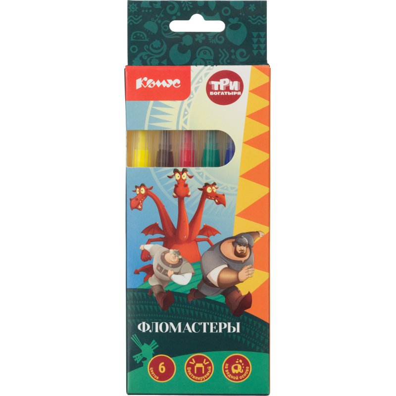 Цветные фломастеры Три Богатыря для рисования на бумаге (6 цветов). Благодаря тому, что фломастеры на водной основе, они легко смываются с большинства материалов и кожи. Вентилируемый колпачок обеспечивает безопасность при использовании фломастеров ребенком (не перекрывает доступ кислорода в случае попадания колпачка в дыхательные пути). Поставляются в картонной упаковке с европодвесом. Размер упаковки: 148.5×66х12 мм.