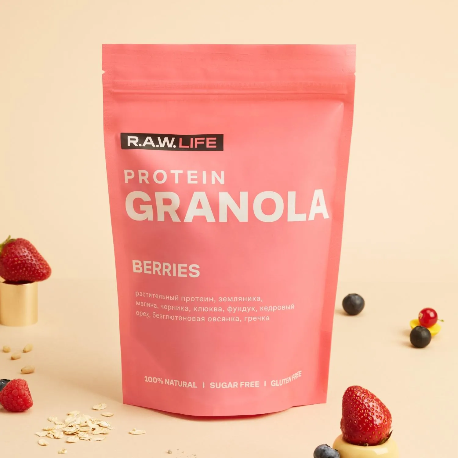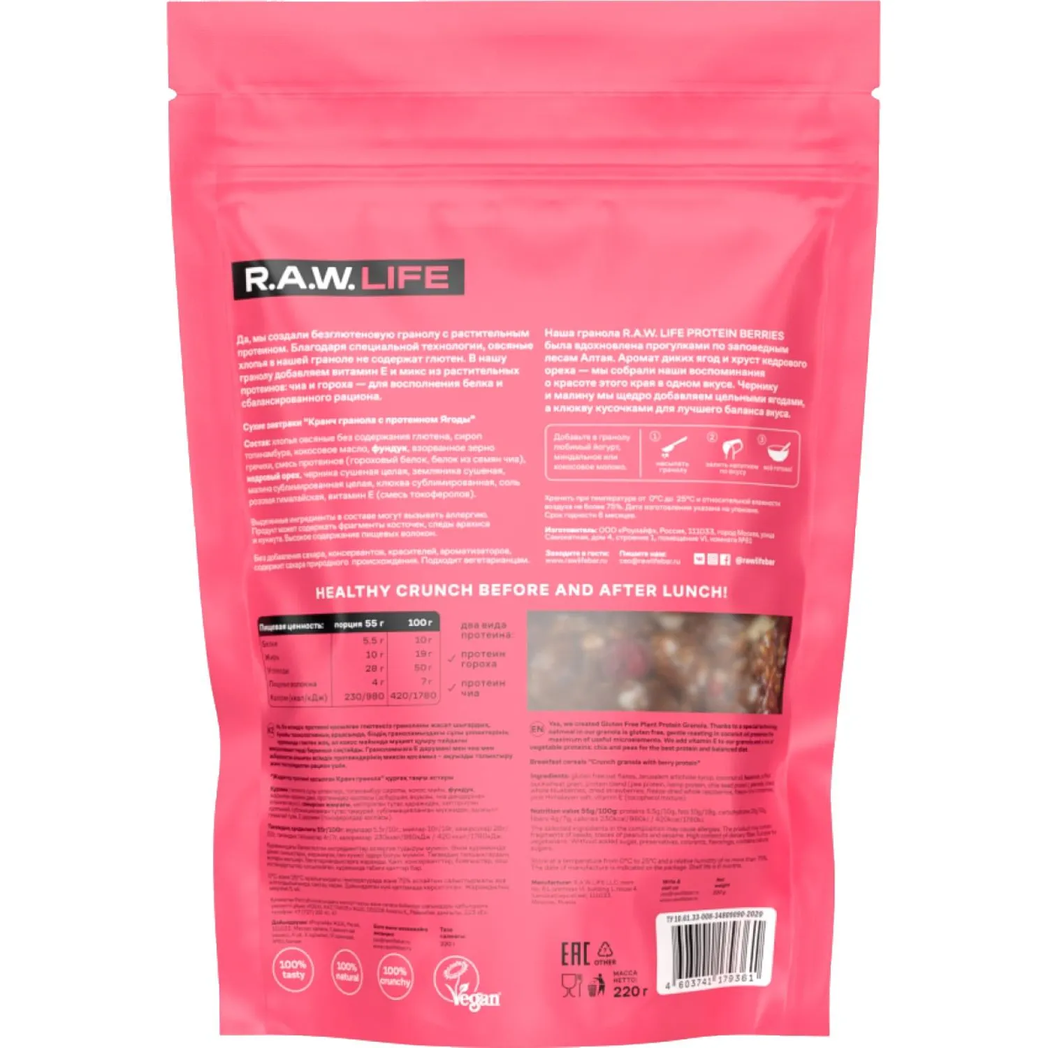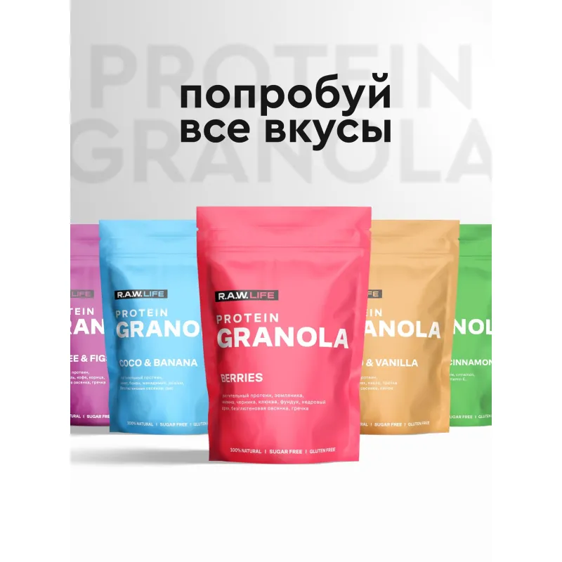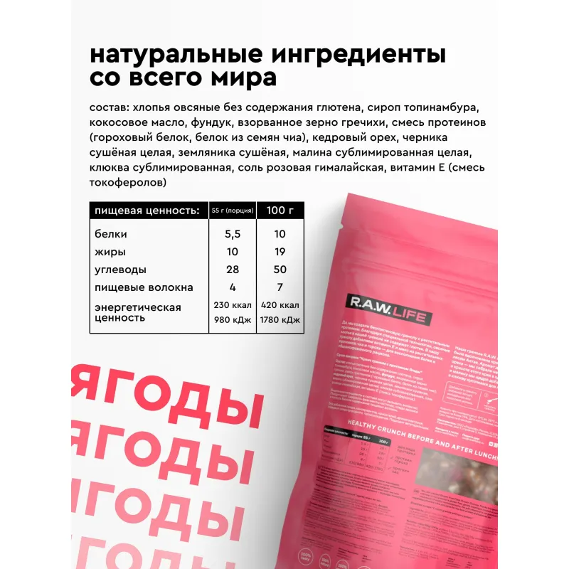 Гранола протеиновая R. A. W. Life ягоды 220 гПротеиновая гранола с ягодами объединяет насыщенный вкус дикорастущих ягод, хруст кедрового ореха и пользу растительных ингредиентов. В составе используется овсянка, не содержащая глютен благодаря особой технологии обработки. Смесь растительных белков из чиа и гороха помогает восполнить потребность в белке и делает рацион более сбалансированным. Витамин Е в составе поддерживает антиоксидантную защиту организма. Продукт не требует варки, его можно употреблять с йогуртом, молоком или в сухом виде. Подходит для тех, кто ищет функциональное питание без сахара и искусственных добавок. Состав: хлопья овсяные без содержания глютена, сироп топинамбура, кокосовое масло, фундук, взорванное зерно гречихи, смесь протеинов (гороховый белок, белок из семян чиа), кедровый орех, черника сушёная целая, земляника сушёная, малина сублимированная цельная, клюква сублимированная, соль гималайская розовая, витамин Е (смесь токоферолов). Продукт может содержать фрагменты косточек, следы арахиса и кунжута. Пищевая ценность на 100 г: белки 10 г, жиры 19 г, углеводы 50 г, пищевые волокна 7 г. Энергетическая ценность на 100 г: 420 ккал/1780 кДж. Пищевая ценность на 55 г (порция): белки 5.5 г, жиры 10 г, углеводы 28 г, пищевые волокна 4 г. Энергетическая ценность на 55 г (порция): 230 ккал/980 кДж. Хранить при температуре от 0 до 25 C в сухом вентилируемом помещении. После вскрытия хранить в герметичной упаковке. Масса нетто: 220 г. Срок годности: 8 месяцев. Произведено в России.