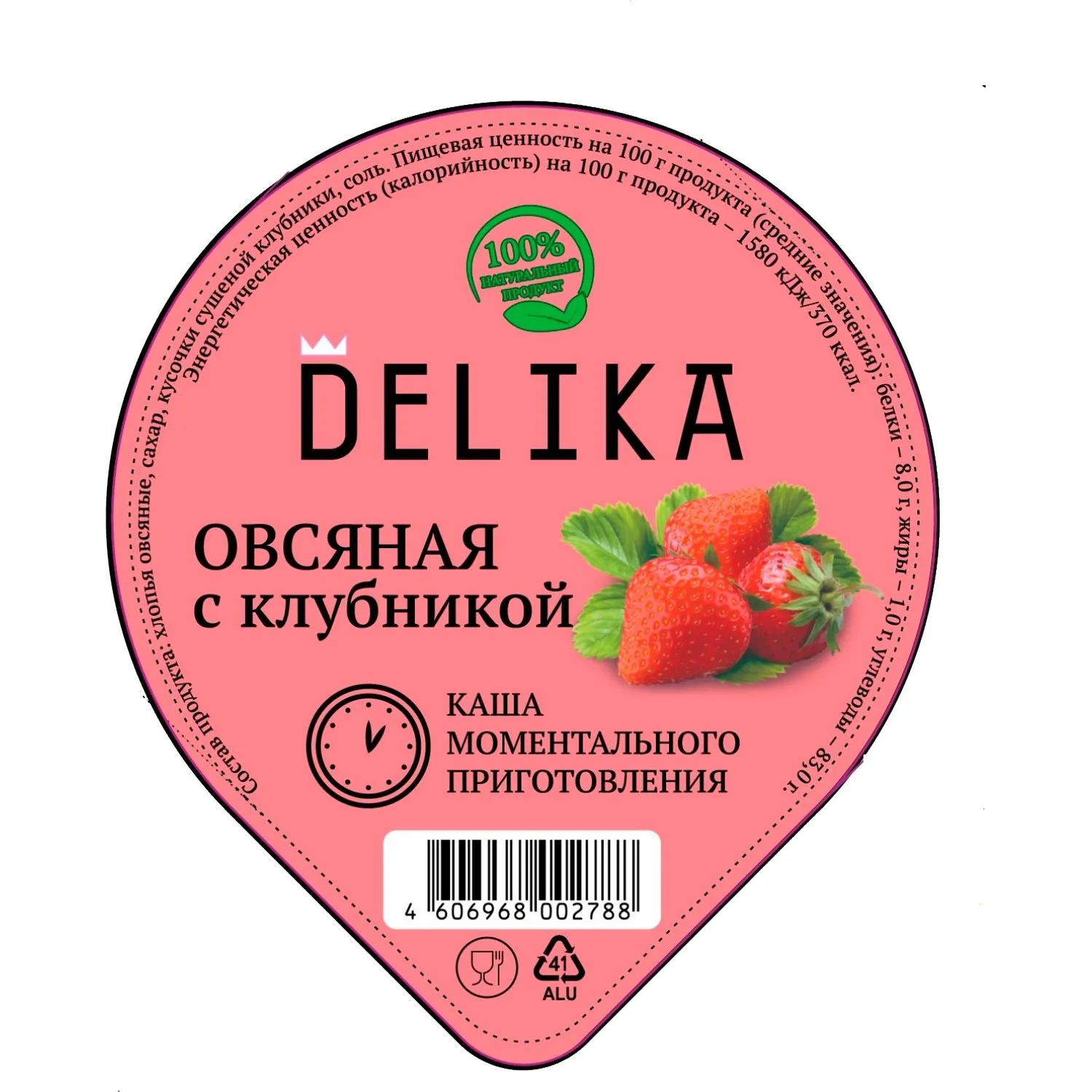 Овсяная каша с клубникой быстрого приготовления запас отличного готового питания, которого хватит надолго! Натуральная еда быстрого приготовления ваш полезный, вкусный, полноценный обед или завтрак. Её можно взять с собой на работу или в поездку. Каша изготовлены из качественных продуктов и упакована в стакан по 43 грамма. Залив сухую смесь водой вы получаете вкуснейшую овсяную кашу с клубникой, которая имеет богатый и уникальный состав витаминов и минеральных веществ. В овсе содержаться витамины Е, А, РР, Н, витамины группы В, микроэлементы кальций, магний, фосфор, калий, цинк. Плюсом этого злака является и большое количество сложных углеводов, которые расщепляются дольше простых углеводов, а значит, постепенно отдают калории организму. Состав: хлопья овсяные, сахар, кусочки клубники, соль. Пищевая ценность: белки 10.0 г; жиры 4.5 г; углеводы 69.0 г. Энергетическая ценность на 100 г продукта: 1510 кДж/360 ккал. Срок годности: 12 месяцев. Условия хранения: хранить в сухом, прохладном месте, при температуре не выше 20C и относительной влажности воздуха не более 75%. Вес: 43 г. Страна производства: Россия.