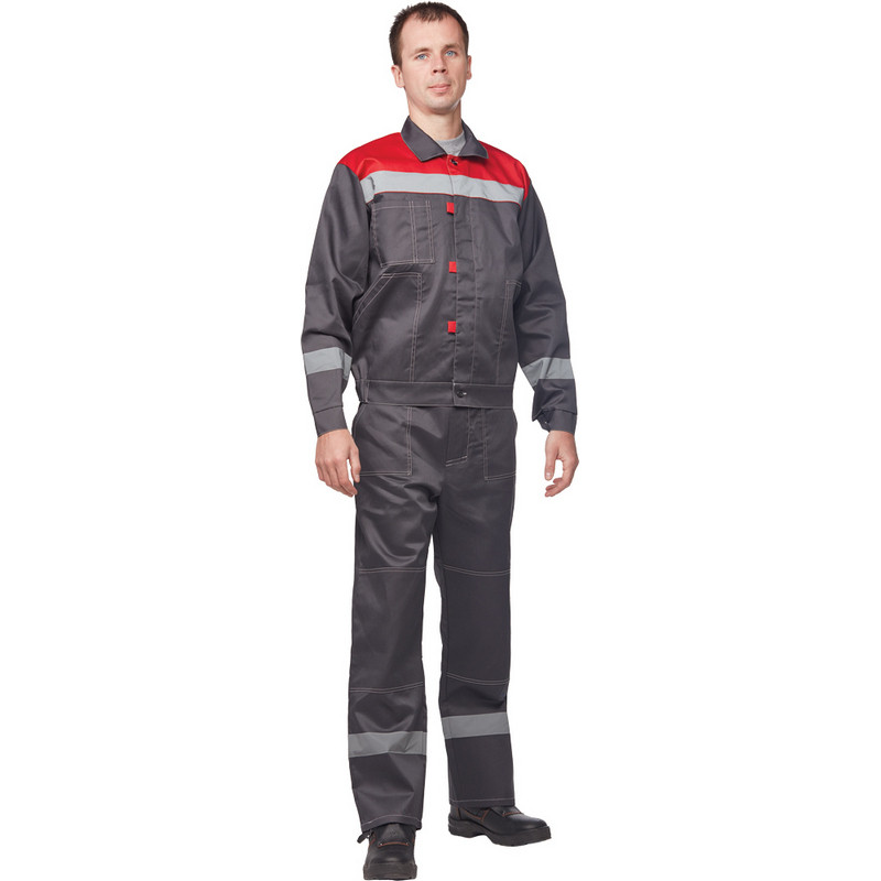 Спецодежда летняя костюм мужской л20-КБР состоит из куртки и брюк (размер 44–46, рост 182–188) серого цвета с красными вставками на куртке. Изготовлен из смесовой ткани (65% полиэфир, 35% хлопок), плотностью 210 г/кв. м. Куртка прямого силуэта с притачным поясом и боковыми вставками с эластичной лентой, для лучшего прилегания. Для защиты от истирания локтевая и коленная части костюма усилены. Все элементы костюма выделены контрастной отстрочкой. На кокетке, рукавах, и брючинах светоотражающая полоса — 5 см.  Костюм обеспечивает защиту от производственных загрязнений. ГОСТ 27575–87. Имеется заключение Минпромторга, с которым можно вернуть до 20% компенсации от расходов на обязательное социальное страхование от несчастных случаев на производстве и профессиональных заболеваний.