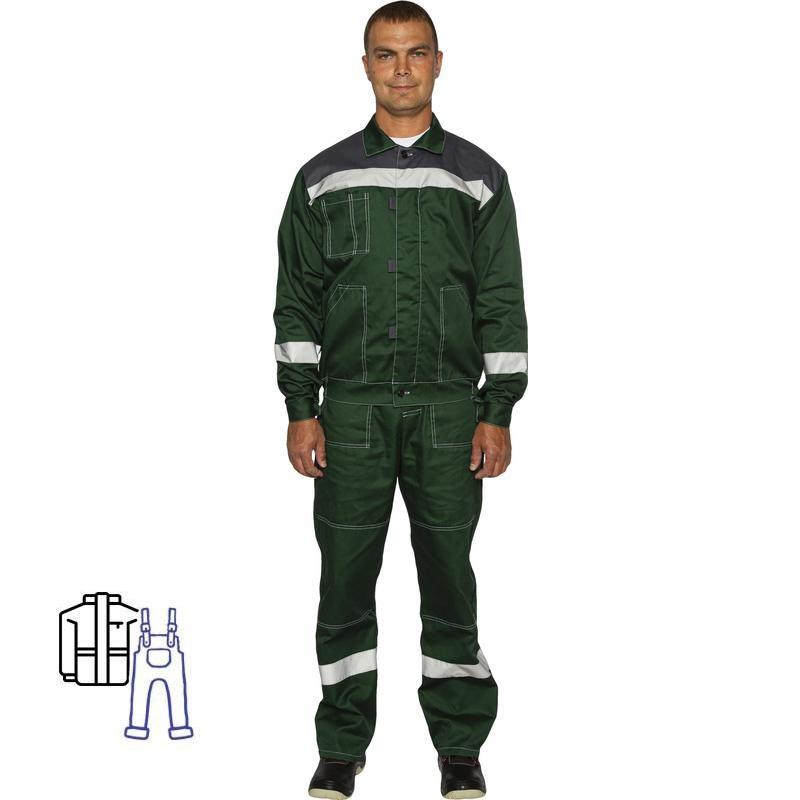 Костюм летний мужской л20-КПК состоит из куртки и полукомбинезона зеленого цвета с серыми вставками на куртке. Изготовлен из смесовой ткани (65% полиэстер, 35% хлопок). Полукомбинезон с накладными карманами, гульфиком на пуговицах, эластичной тесьмой по талии спинки и регулируемыми бретелями. Куртка прямого силуэта c объемными накладными карманами и супатнoй застежкой на пуговицы. Куртка и полукомбинезон оснащены светоотражающей полосой. Размер: 48-50. Рост: 182-188.