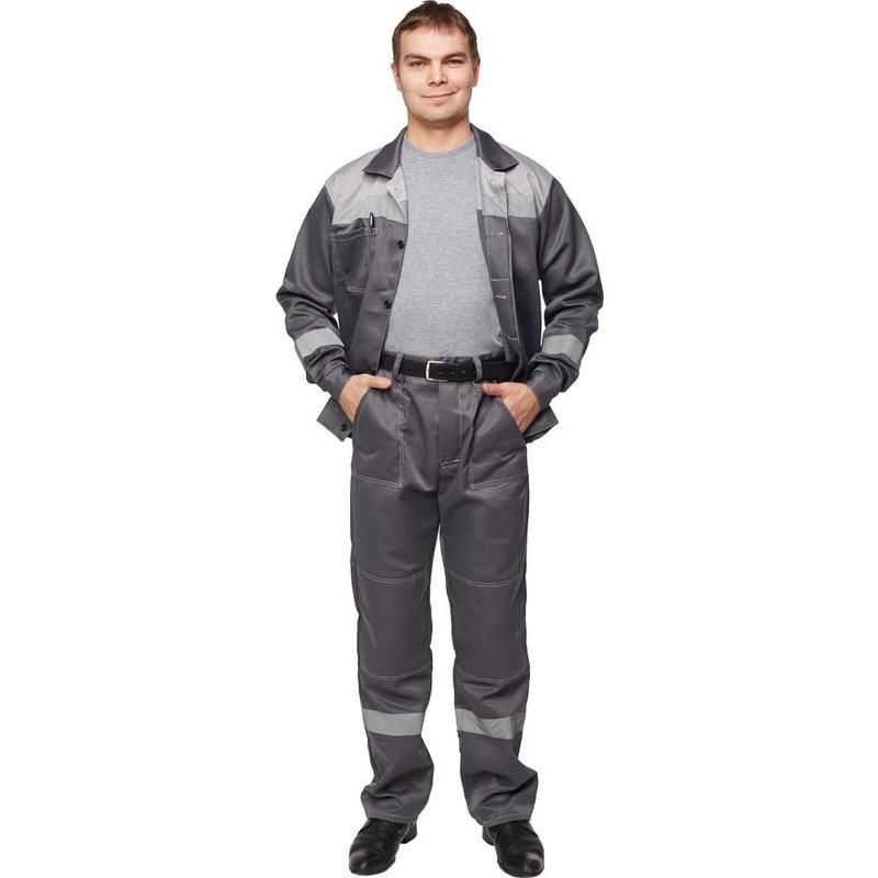 Спецодежда костюм мужской л22-КБР состоит из куртки и брюк (размер 56-58, рост 194-200) темно-серого цвета со светло-серыми вставками. Изготовлен из смесовой ткани (68% — полиэфир, 32% — хлопок) плотностью 210 г/кв. м. Светоотражающая полоса шириной 50 мм размещена на груди, спине, рукавах, а также внизу брюк. Куртка укороченная на поясе, с супатной застежкой на пять петель-пуговиц. Полочка отрезная по линии кокетки, подбор цельнокроеный. Воротник отложной, на куртке три накладных кармана: один верхний нагрудный карман справа с отсрочкой под ручку и два нижних кармана с боковым входом. Рукава с налокотниками и манжетами. Спинка отрезная по линии кокетки. Пояс притачной шириной 4-5 см, с эластичной лентой по бокам. Брюки прямого силуэта, оснащены наколенниками, наличие пяти шлевок. На передней половине брюк расположены два накладных кармана со скошенным входом, гульф (молния). Пояс с пятью шлевками. Весь костюм сшит контрастными нитками белого цвета, двойной строчкой. Костюм предназначен для защиты от общих производственных загрязнений и механических воздействий. ГОСТ 27575-87.