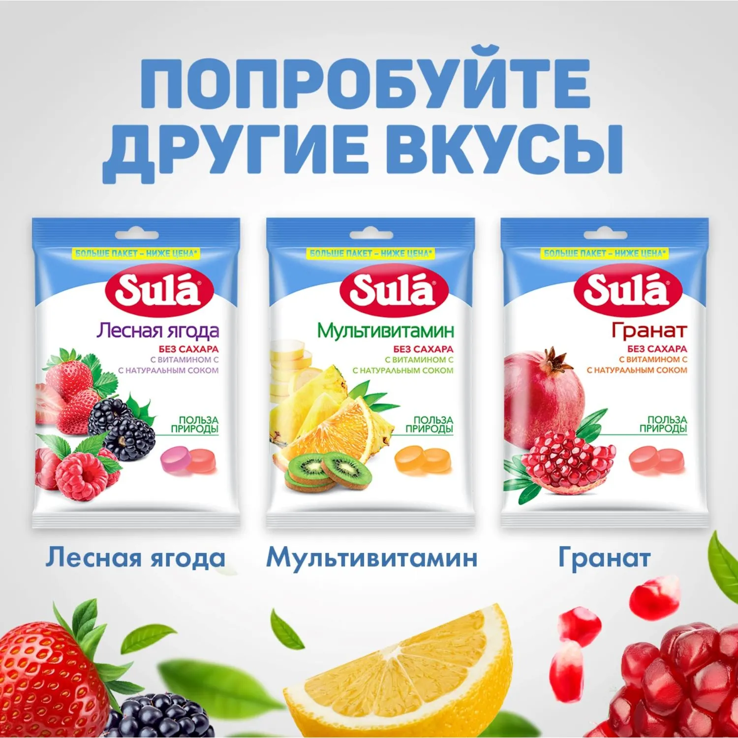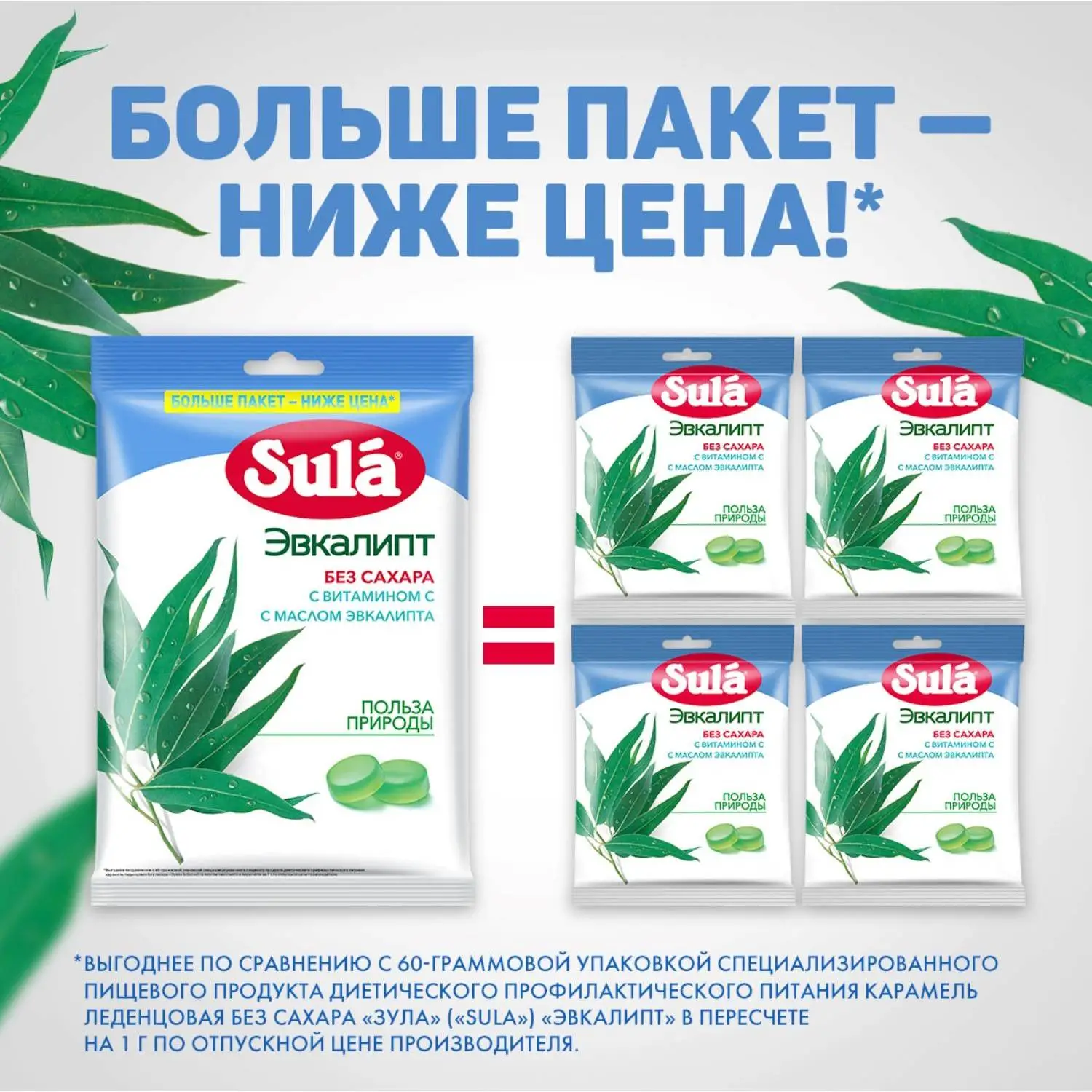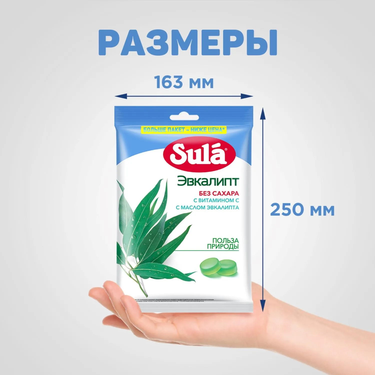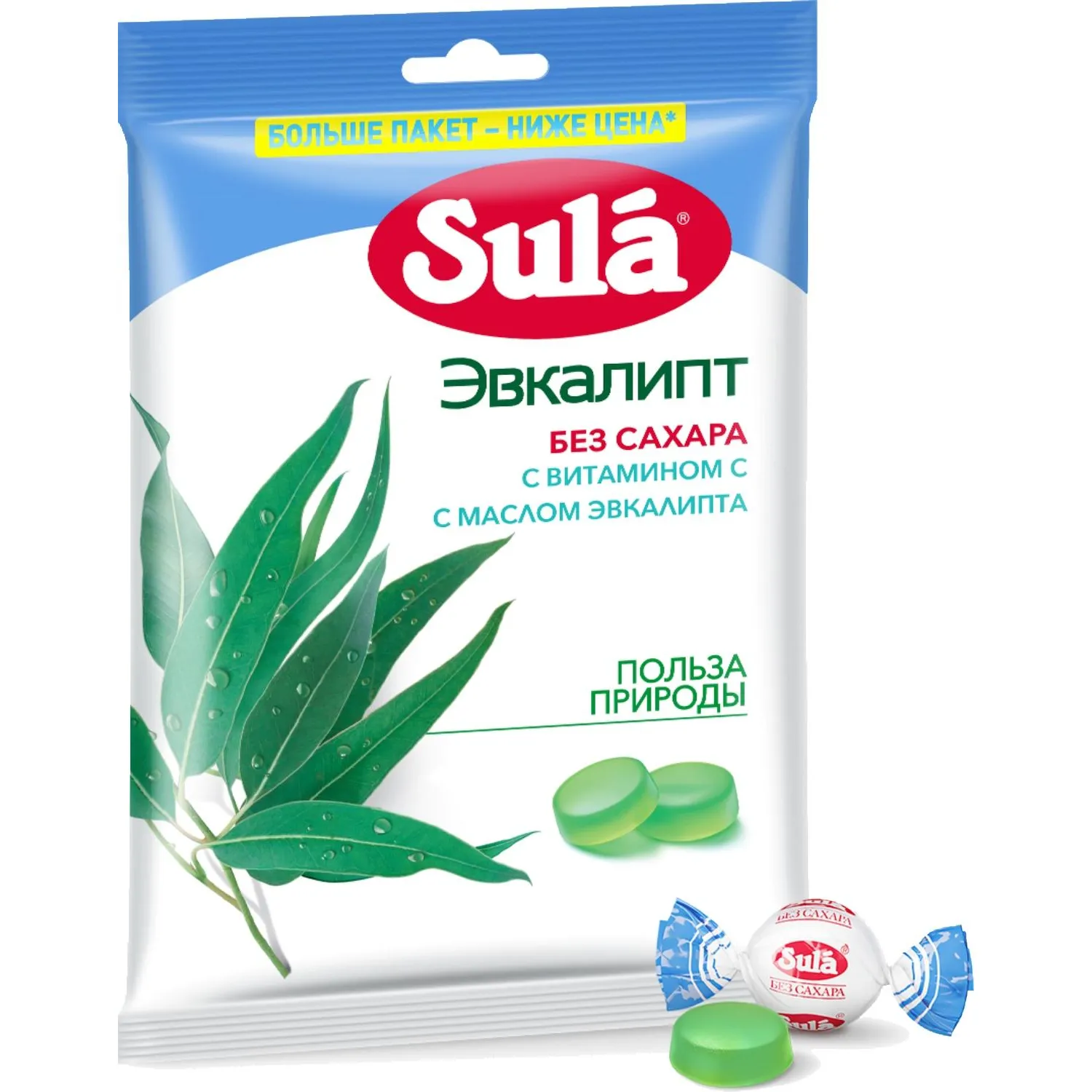 Леденцы Sula эвкалипт без сахара 249 гЛеденцы Sula Эвкалипт, без сахара, с витамином С, с маслом эвкалипта это леденцы без сахара со вкусом эвкалипта и эфирным маслом эвкалипта в составе. Леденцы Sula не содержат сахара, поэтому подходят для людей с диабетом 2 типа. Кроме того, леденцы без сахара Sula со вкусом эвкалипта содержат витамин С, который способствует нормализации образования коллагена и улучшению работы кровеносных сосудов. Всего 10 леденцов без сахара полностью удовлетворяют рекомендуемый уровень суточного потребления витамина С, а также радуют насыщенным вкусом и дарят хорошее настроение! Леденцы Sula помещаются в кармане, сумке или рюкзаке: они упакованы в компактные пакеты, которые всегда удобно брать с собой. Леденцы без сахара Sula со вкусом эвкалипта это вкусное и полезное лакомство. Каждый леденец имеет индивидуальную упаковку поэтому ими легко делиться с другими. Ищете вкусные и полезные сладости Попробуйте леденцы без сахара Sula Эвкалипт и убедитесь: приятный вкус, отличное настроение и польза природы будут всегда с вами! Область применения: в качестве специализированного пищевого продукта диетического профилактического питания для больных, страдающих диабетом 2 типа, а также для лиц, контролирующих содержание сахара в крови. Состав: подсластитель (сорбитовый сироп), загуститель (гуммиарабик), витамин С, натуральные ароматизаторы, подсластитель (сорбит), красители (куркумин, медные комплексы хлорофиллинов), эфирное масло эвкалипта. Содержит подсластители. При чрезмерном употреблении могут оказывать слабительное действие. Может содержать следы молока. Пищевая и энергетическая ценность (средние значения), содержание в 100 г продукта: витамин С 228 мг, углеводы 97 г, в том числе сахароспирты (сорбит) 96 г, энергетическая ценность (калорийность) 980 кДж (230 ккал);содержание в суточной порции (10 леденцов или 30 г): витамин С 68 мг, углеводы 29 г, в том числе сахароспирты (сорбит) 29 г, энергетическая ценность (калорийность) 290 кДж (71 ккал);% от РУСПx (10 леденцов или 30 г): витамин С 113%xx, углеводы 8%, в том числе сахароспирты (сорбит) 192 %xx, энергетическая ценность (калорийность) 3%. x % от рекомендуемого уровня суточного потребленияxx Не превышает верхний допустимый уровень суточного потребления. Употреблять не более 5 леденцов за один приём. Суточная порция не должна превышать 10 леденцов. Условия хранения: хранить при температуре не более 25 С и относительной влажности воздуха не более 60%. Избегать попадания прямого солнечного света. Номер сертификата: RU.77.99.32.004. Е.000775.02.18Внешний вид и/или характеристики товара могут быть изменены производителем в соответствии с производственным процессом.
