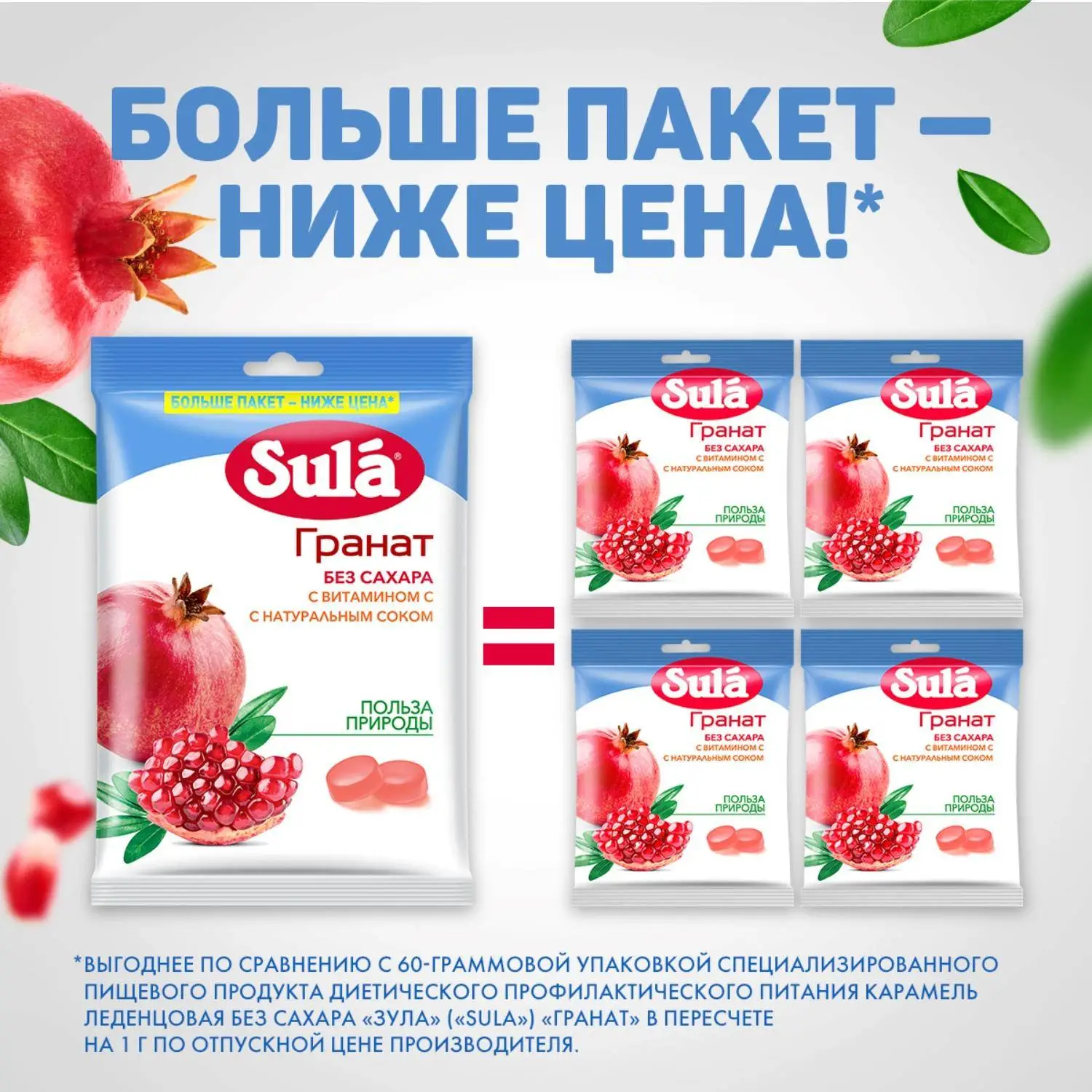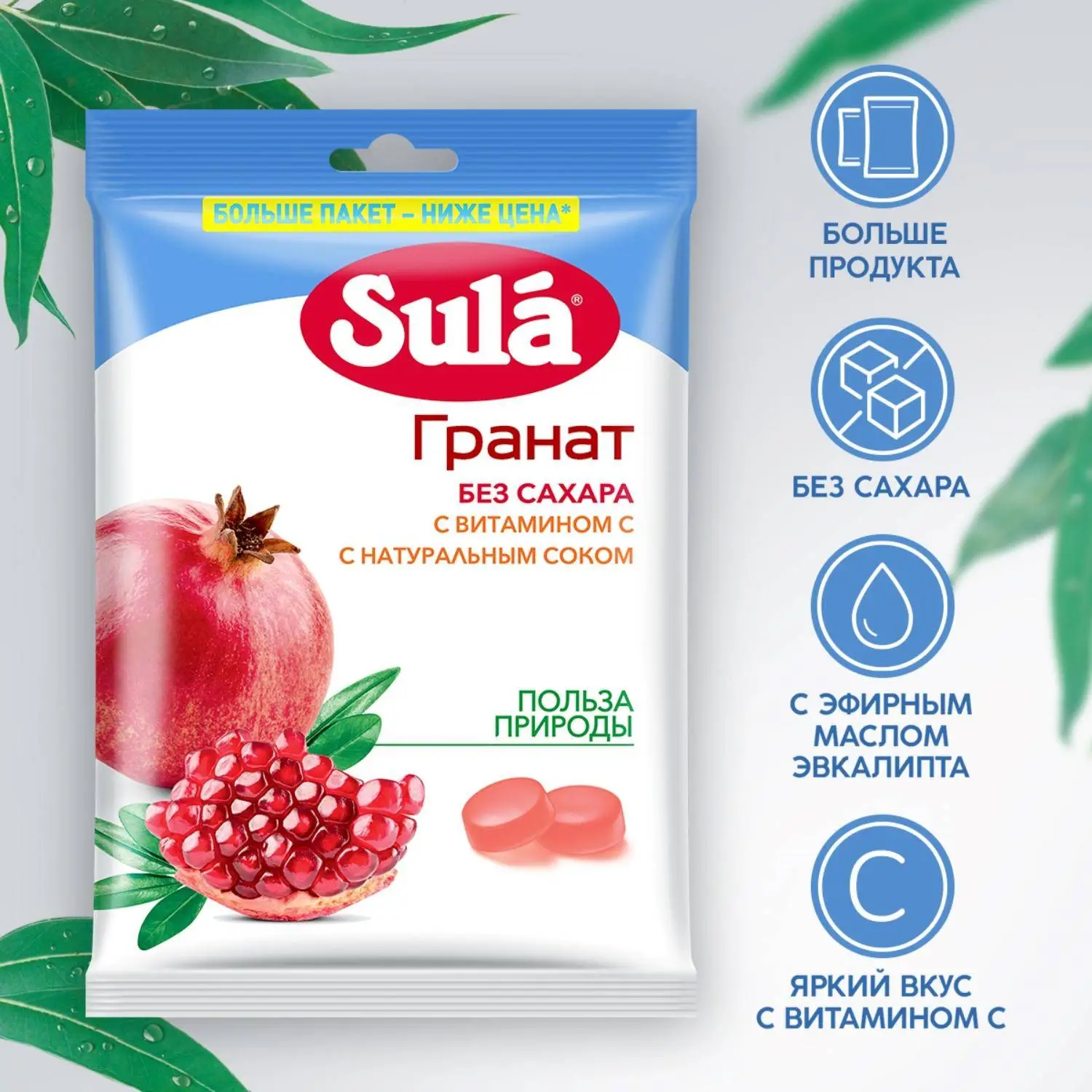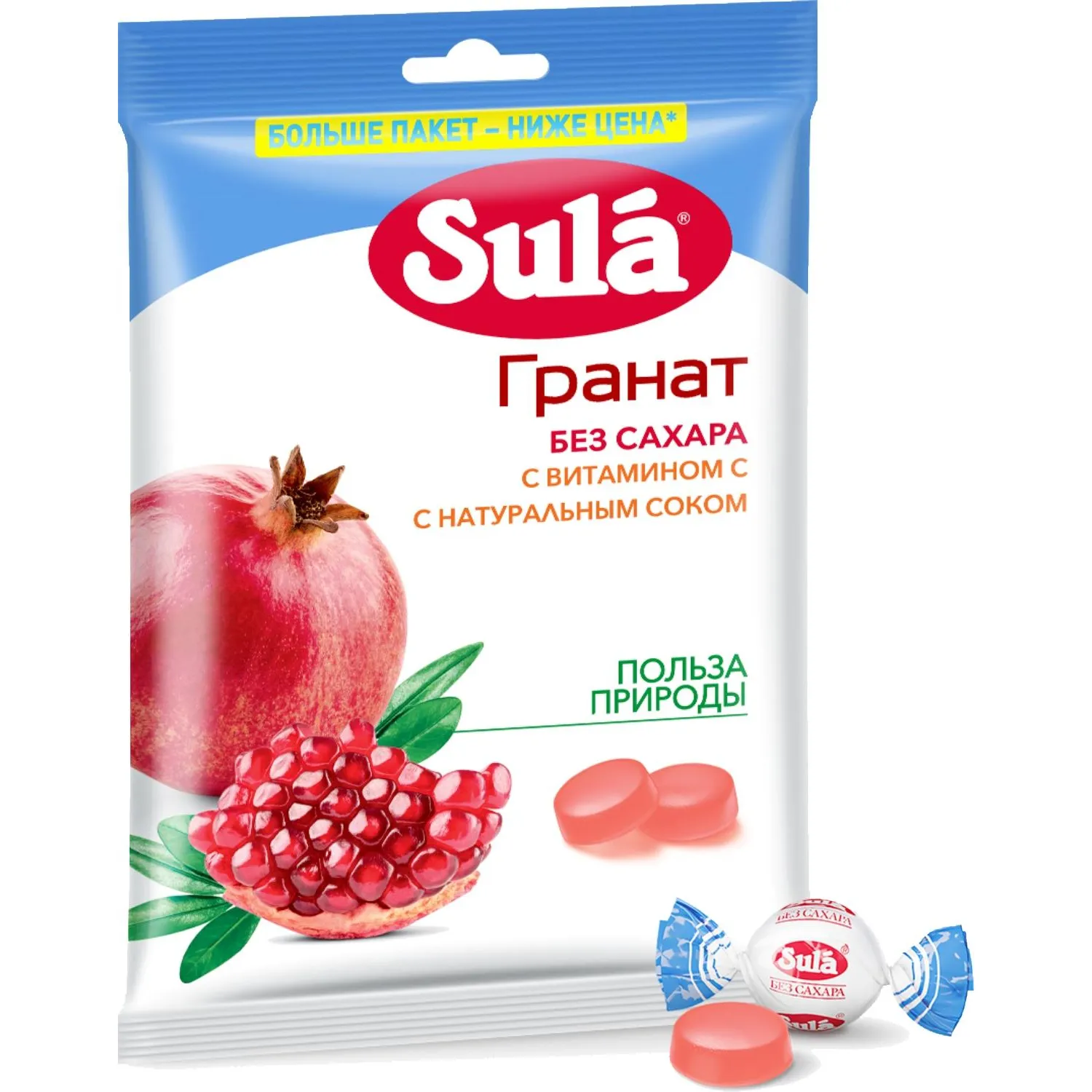 Леденцы Sula гранат без сахара 249 гЛеденцы Sula Гранат, без сахара, с витамином С, с соком это леденцы без сахара со вкусом сочного граната. Леденцы Sula не содержат сахара, поэтому подходят для людей с диабетом 2 типа. Кроме того, леденцы без сахара Sula со вкусом граната содержат витамин С, который способствует нормализации образования коллагена и улучшению работы кровеносных сосудов. Всего 10 леденцов без сахара полностью удовлетворяют рекомендуемый уровень суточного потребления витамина С, а также радуют насыщенным вкусом и дарят хорошее настроение! Леденцы Sula помещаются в кармане, сумке или рюкзаке: они упакованы в компактные пакеты, которые всегда удобно брать с собой. Леденцы без сахара Sula со вкусом граната это вкусное и полезное лакомство. Каждый леденец имеет индивидуальную упаковку поэтому ими легко делиться с другими. Ищете вкусные и полезные сладости Попробуйте леденцы без сахара Sula Гранат и убедитесь: приятный вкус, отличное настроение и польза природы будут всегда с вами! Область применения: в качестве специализированного пищевого продукта диетического профилактического питания для больных, страдающих диабетом 2 типа, а также для лиц, контролирующих содержание сахара в крови. Состав: подсластитель (сорбитовый сироп), регуляторы кислотности (молочная кислота, лимонная кислота), загуститель (гуммиарабик), концентрированные соки (аронии, граната), натуральный ароматизатор, витамин С, подсластитель (сорбит). Содержит подсластители. При чрезмерном употреблении могут оказывать слабительное действие. Может содержать следы молока. Пищевая и энергетическая ценность (средние значения), содержание в 100 г продукта: витамин С 220 мг, углеводы 96 г, в том числе сахароспирты (сорбит) 94 г, энергетическая ценность (калорийность) 990 кДж (240 ккал);содержание в суточной порции (10 леденцов или 30 г): витамин С 66 мг, углеводы 29 г, в том числе сахароспирты (сорбит) 28 г, энергетическая ценность (калорийность) 300 кДж (71 ккал);% от РУСПx (10 леденцов или 30 г): витамин С 110%xx, углеводы 8%, в том числе сахароспирты (сорбит) 189 %xx, энергетическая ценность (калорийность) 3%. x % от рекомендуемого уровня суточного потребленияxx Не превышает верхний допустимый уровень суточного потребления. Употреблять не более 5 леденцов за один приём. Суточная порция не должна превышать 10 леденцов. Условия хранения: хранить при температуре не более 25 С и относительной влажности воздуха не более 60%. Избегать попадания прямого солнечного света. Номер сертификата: RU.77.99.32.004. Е.000775.02.18Внешний вид и/или характеристики товара могут быть изменены производителем в соответствии с производственным процессом.