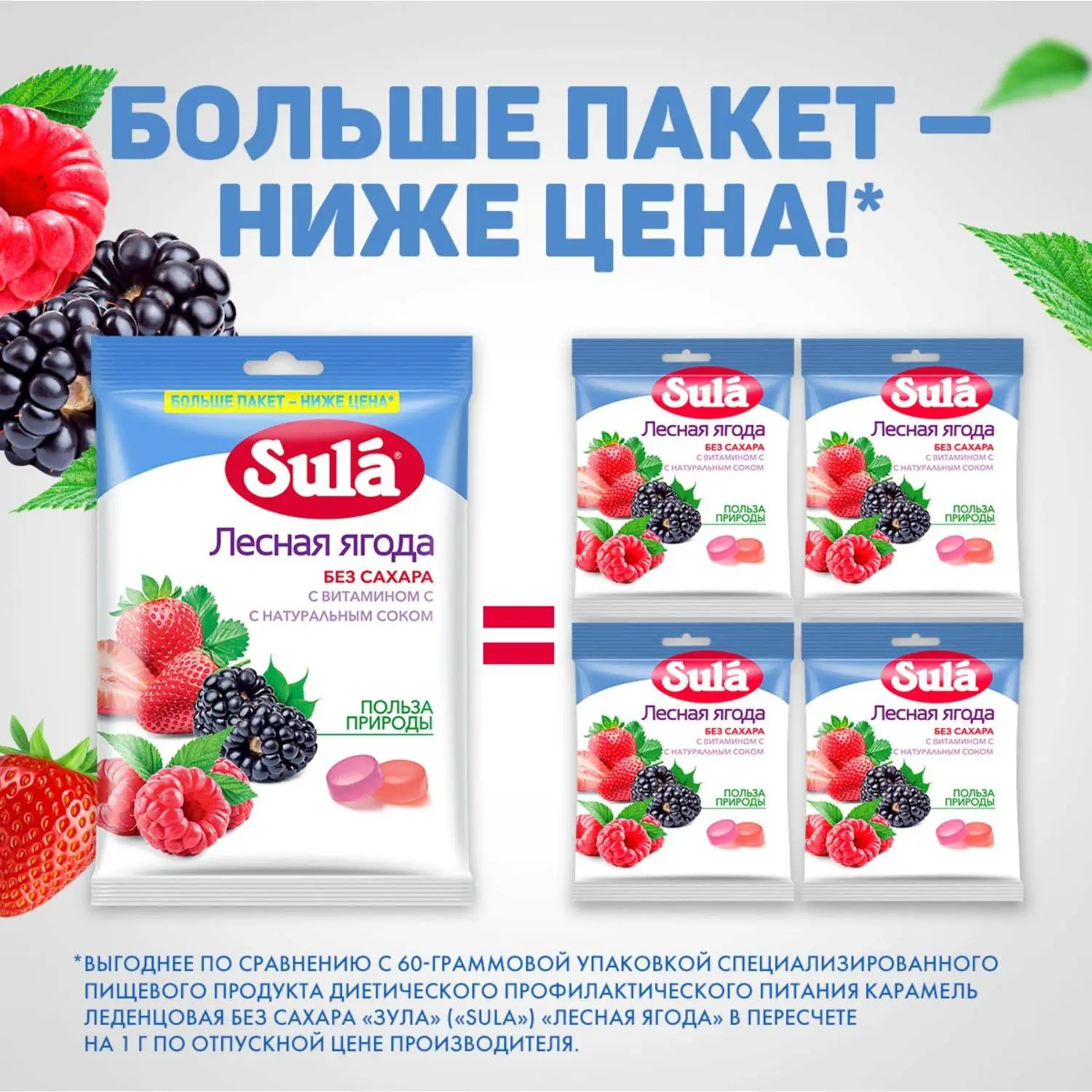 Леденцы Sula Лесная Ягода ассорти без сахара 249 гЛеденцы Sula Лесная ягода, без сахара, с витамином С, с соком это леденцы без сахара со вкусом сочных и ароматных лесных ягод. Леденцы Sula обладают натуральным и ярким вкусом малины, клубники и ежевики, так как они изготовлены с добавлением фруктового сока. Леденцы Sula не содержат сахара, поэтому подходят для людей с диабетом 2 типа. Кроме того, леденцы без сахара Sula Лесная ягода содержат витамин С, который способствует нормализации образования коллагена и улучшению работы кровеносных сосудов. 10 леденцов без сахара полностью удовлетворяют рекомендуемый уровень суточного потребления витамина С, а также радуют насыщенным вкусом и дарят хорошее настроение! Леденцы Sula помещаются в кармане, сумке или рюкзаке: они упакованы в компактные пакеты, которые всегда удобно брать с собой. Леденцы без сахара Sula Лесная ягода это вкусное и полезное лакомство. Каждый леденец имеет индивидуальную упаковку поэтому ими легко делиться с другими. Ищете вкусные и полезные сладости Попробуйте леденцы без сахара Sula Лесная ягода и убедитесь: приятный вкус, отличное настроение и польза природы будут всегда с вами! Область применения: в качестве специализированного пищевого продукта диетического профилактического питания для больных, страдающих диабетом 2 типа, а также для лиц, контролирующих содержание сахара в крови. Лесная ягода со вкусом малины, клубники. Состав: подсластитель (сорбитовый сироп), загуститель (гуммиарабик), регуляторы кислотности (молочная кислота, лимонная кислота), концентрированные соки (вишнёвый, клубничный, малиновый, черничный, черносмородиновый), витамин С, подсластитель (сорбит), натуральные ароматизаторы, краситель (антоцианы). Содержит подсластители. При чрезмерном употреблении могут оказывать слабительное действие. Может содержать следы молока. Лесная ягода со вкусом ежевики. Состав: подсластитель (сорбитовый сироп), загуститель (гуммиарабик), регуляторы кислотности (молочная кислота, лимонная кислота), краситель (антоцианы), натуральный ароматизатор, витамин С, подсластитель (сорбит), концентрированная фруктовая паста (яблочный сок, яблочная мякоть, сок лайма, клубничная мякоть, вишнёвый сок, ананасовый сок, апельсиновый сок, лимонный сок, персиковое пюре, сок ежевики, малиновое пюре, банановое пюре, черничный сок, сок арбуза, мякоть киви, мякоть манго), концентрированные соки (вишнёвый, клубничный, малиновый, черничный, черносмородиновый). Содержит подсластители. При чрезмерном употреблении могут оказывать слабительное действие. Может содержать следы молока. Пищевая и энергетическая ценность (средние значения), содержание в 100 г продукта: витамин С 220 мг, углеводы 96 г, в том числе сахароспирты (сорбит) 94 г, энергетическая ценность (калорийность) 990 кДж (240 ккал);содержание в суточной порции (10 леденцов или 30 г): витамин С 66 мг, углеводы 29 г, в том числе сахароспирты (сорбит) 28 г, энергетическая ценность (калорийность) 300 кДж (71 ккал);% от РУСПx (10 леденцов или 30 г): витамин С 110%xx, углеводы 8%, в том числе сахароспирты (сорбит) 189 %xx, энергетическая ценность (калорийность) 3%. x % от рекомендуемого уровня суточного потребленияxx Не превышает верхний допустимый уровень суточного потребления. Употреблять не более 5 леденцов за один приём. Суточная порция не должна превышать 10 леденцов. Условия хране