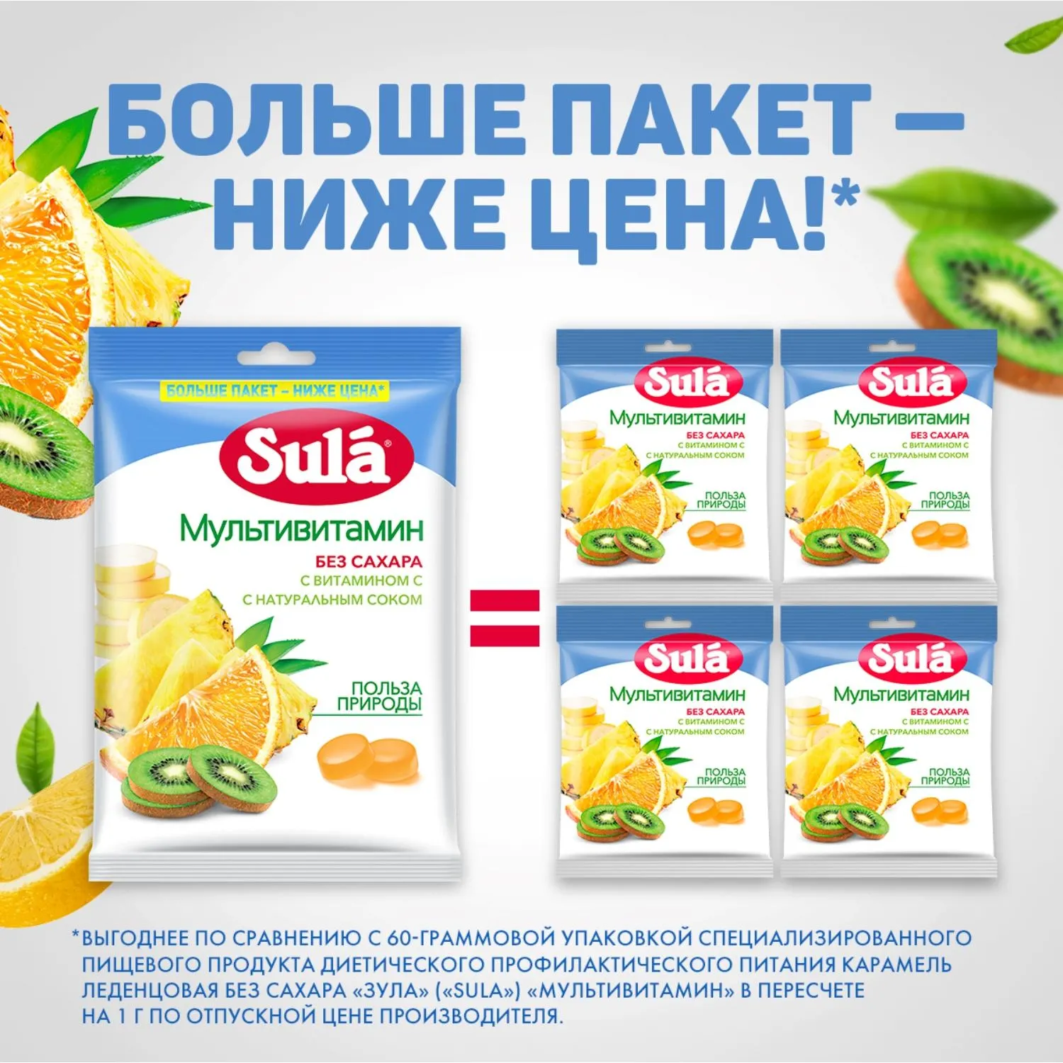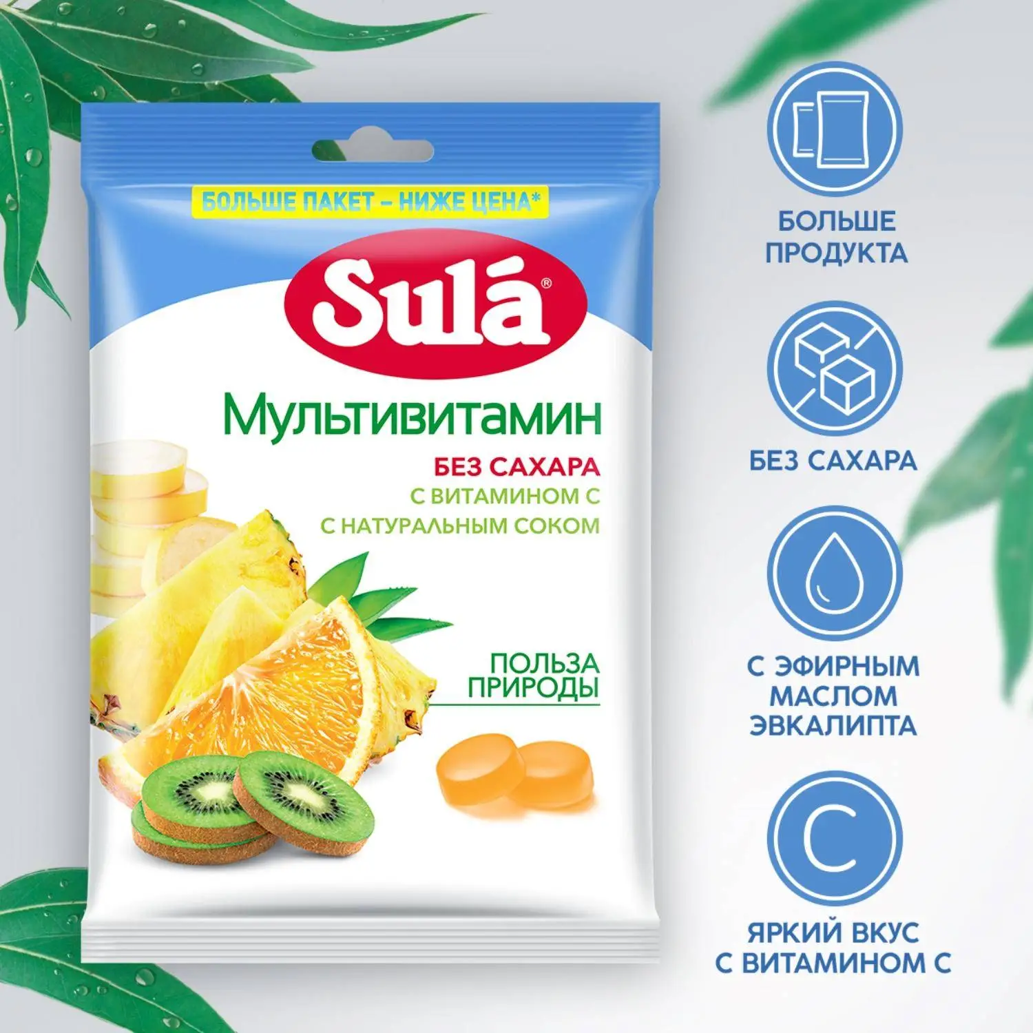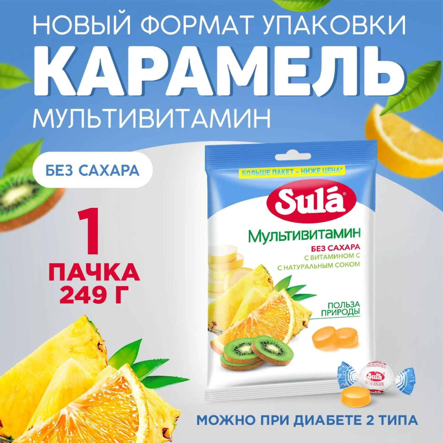 Леденцы Sula Мультивитамин ассорти без сахара 249 гЛеденцы Sula Мультивитамин, без сахара, с витамином С, с соком это леденцы без сахара со вкусом экзотических фруктов и витаминным премиксом в составе. Леденцы Sula не содержат сахара, поэтому подходят для людей с диабетом 2 типа. Кроме того, леденцы без сахара Sula Мультивитамин содержат в составе витамины С, Е, В12 и В6. 10 леденцов без сахара полностью удовлетворяют рекомендуемый уровень суточного потребления витамина С, а также радуют насыщенным вкусом и дарят хорошее настроение! Леденцы Sula помещаются в кармане, сумке или рюкзаке: они упакованы в компактные пакеты, которые всегда удобно брать с собой. Леденцы без сахара Sula Мультивитамин это вкусное и полезное лакомство. Каждый леденец имеет индивидуальную упаковку поэтому ими легко делиться с другими. Ищете вкусные и полезные сладости Попробуйте леденцы без сахара Sula Мультивитамин и убедитесь: приятный вкус, отличное настроение и польза природы будут всегда с вами! Область применения: в качестве специализированного пищевого продукта диетического профилактического питания для больных, страдающих диабетом 2 типа, а также для лиц, контролирующих содержание сахара в крови. Состав: подсластитель (сорбитовый сироп), регуляторы кислотности (молочная кислота, лимонная кислота), загуститель (гуммиарабик), натуральные ароматизаторы, витаминный премикс (мальтодекстрин, витамин С, ниацин, витамин Е, пантотеновая кислота, рибофлавин, витамин В6, фолацин, биотин, витамин В12), краситель (куркумин), подсластитель (сорбит), концентрированная фруктовая паста (яблочный сок, яблочная мякоть, сок лайма, клубничная мякоть, вишнёвый сок, ананасовый сок, апельсиновый сок, лимонный сок, персиковое пюре, сок ежевики, малиновое пюре, банановое пюре, черничный сок, сок арбуза, мякоть киви, мякоть манго), концентрированный сок апельсина. Содержит подсластители. При чрезмерном употреблении могут оказывать слабительное действие. Может содержать следы молока. Пищевая и энергетическая ценность (средние значения), содержание в 100 г продукта: витамин С 223 мг, ниацин 14 мг, витамин Е 7 мг, пантотеновая кислота 3.5 мг, рибофлавин 1.5 мг, витамин В6 1.4 мг, фолацин 141 мкг, биотин 33 мкг, витамин В12 2.1 мкг, углеводы 96 г, в том числе сахароспирты (сорбит) 95 г, энергетическая ценность (калорийность) 980 кДж (235 ккал);содержание в суточной порции (10 леденцов или 30 г): витамин С 67 мг, ниацин 4 мг, витамин Е 2 мг, пантотеновая кислота 1 мг, рибофлавин 0.45 мг, витамин В6 0.42 мг, фолацин 42 мкг, биотин 10 мкг, витамин В12 0.63 мкг, углеводы 29 г, в том числе сахароспирты (сорбит) 28 г, энергетическая ценность (калорийность) 290 кДж (71 ккал);% от РУСПx (10 леденцов или 30 г): витамин С 111%xx, ниацин 23%, витамин Е 21%, пантотеновая кислота 17%, рибофлавин 28%, витамин В6 21%, фолацин 21%, биотин 20%, витамин В12 63%, углеводы 8%, в том числе сахароспирты (сорбит) 189%xx, энергетическая ценность (калорийность) 3%. x % от рекомендуемого уровня суточного потребленияxx Не превышает верхний допустимый уровень суточного потребления. Употреблять не более 5 леденцов за один приём. Суточная порция не должна превышать 10 леденцов. Условия хранения: хранить при температуре не более 25 С и относительной влажности воздуха не более 60%. Избегать попадания прямого солнечного света. Номер сертификата: RU.77.99.32.004. Е.000775.02.18Внешний вид и/или характеристики товара могут быть изменен