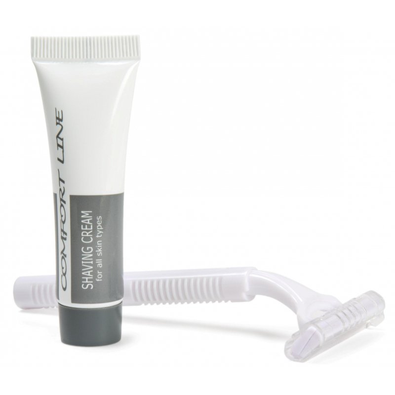 Набор бритвенный Hotel Collection включает в себя бритвенный станок с двойным лезвием, плавающей головкой и увлажняющей полоской, и крем для бритья 8 г. Состав крема: вода деионизированная, лауретсульфат натрия, диэтаноламид жирных кислот кокосового масла, кокамидопропил сульфобетаин, глицерат - 2 кокоат, лаурет натрия - 11 карбоксилат+лаурет - 10, натрий хлористый, лаурил ПГ-тримониум хлорид, аллантоин, дезарон метилхлоризотиалолинон, тетранитриевая соль ЭДТА, кислота лимонная, экстракты репейника, череды, протеина пшеницы, парфюмерная композиция, краситель пищевой. Количество в коробе: 200 штук. Срок годности 36 месяцев.
