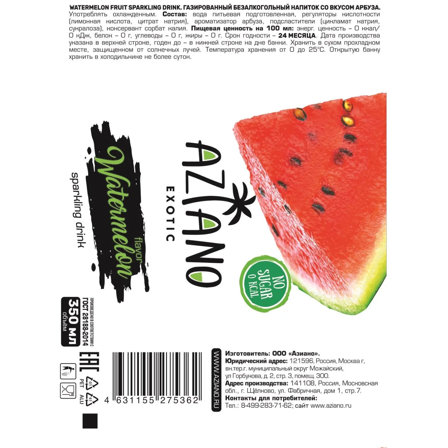 Напиток Aziano Watermelon, газ ж/б 0.35л