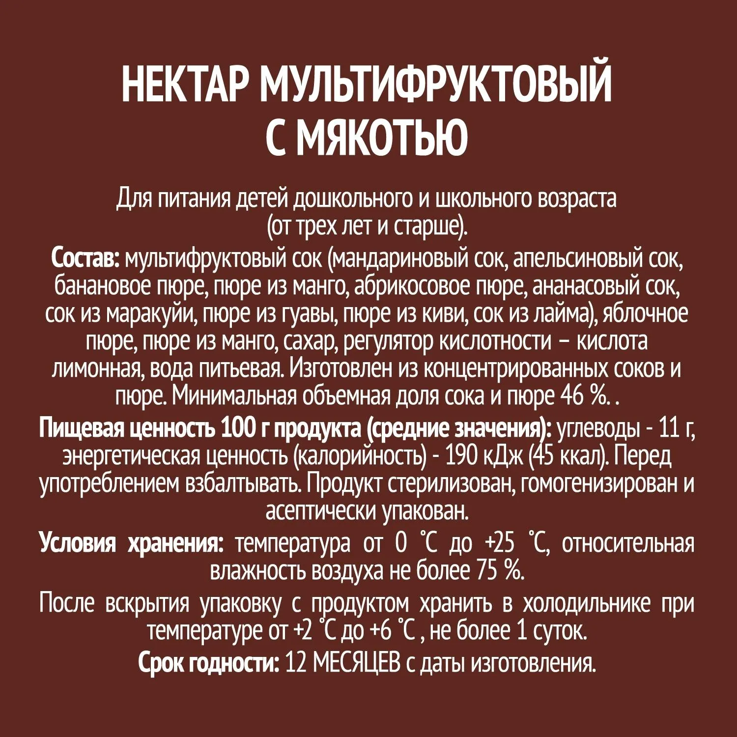 Мультифруктовый нектар с мякотью Дары Кубани натуральный продукт для здорового питания взрослых и детей старше 3 лет. Без консервантов, без ГМО, без красителей и искусственных добавок. В составе содержится 100% яблочный, мандариновый, виноградный, апельсиновый, ананасовый сок, а также соки других экзотических фруктов. Мультифруктовый нектар поднимет настроение, а также подарит яркий и солнечный вкус жарких тропиков. В мультифруктовом нектаре содержатся полезные витамины и минеральные вещества, которые положительно влияют на организм человека. Продукт от Южной соковой компании имеет высокий стандарт качества благодаря контролю на всех этапах производства. Многослойная упаковка Тетра Пак 1 л надёжно сохраняет пользу и вкус сокового продукта. Мультифруктовый нектар можно купить для дома на каждый день, праздника или путешествия. Фруктовый нектар изготовлен из натурального концентрированного сока. Дары Кубани сила солнца, сила витаминов! Состав: яблочный сок, мандариновый сок, виноградный сок, апельсиновый сок, банановое пюре, пюре из манго, ананасовый сок, абрикосовое пюре, сок из маракуйи, пюре из гуавы, пюре из киви, сок из лайма; сахар, регулятор кислотности кислота лимонная, вода. Пищевая ценность в 100 г: углеводы 11 г. Энергетическая ценность: 45 ккал (190 кДж). Условия хранения: хранить при температуре от 0 С до +25 С, с относительной влажностью воздуха не более 75 %. После вскрытия упаковку с продуктом хранить в холодильнике при температуре от +2 С до +6 С, не более 1 суток. Внешний вид и/или характеристики товара могут быть изменены производителем в соответствии с производственным процессом.