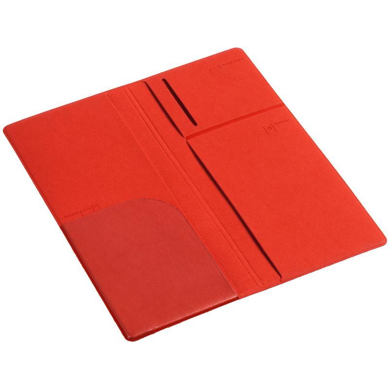 Органайзер из искусственного материала, имитирующего сафьяновую кожу, имеет 5 отделений: для билетов, паспорта, визиток или кредитных карт.