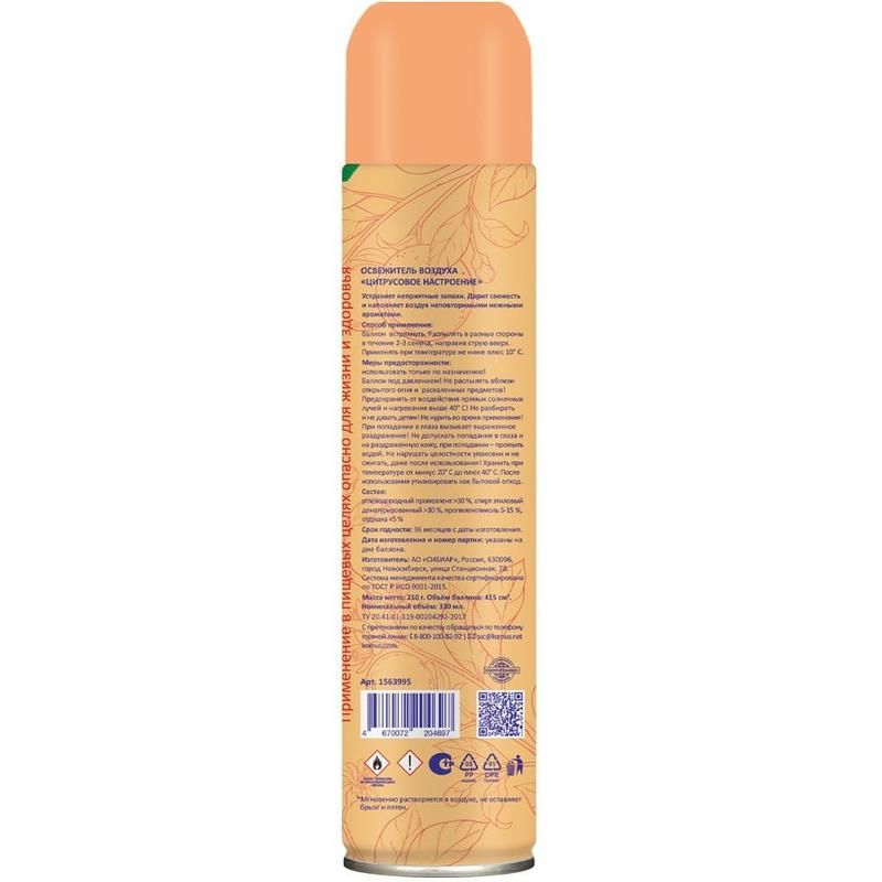 Освежитель воздуха Luscan Цитрусовое настроение 330 мл (сухое распыление). Назначение/особенности: Освежитель для воздуха Luscan нейтрализует запахи и дарит нежный цитрусовый аромат. Подходит для дома и любых общественных мест. Формула сухого распыления экономична в использовании и не оставляет следов на поверхности. Способ применения: Баллон встряхнуть. Распылять в разные стороны в течение 2–3 секунд, направив струю вверх. Применять при температуре не ниже плюс 10°C. Меры предосторожности: Использовать только по назначению! Баллон под давлением! Не распылять вблизи открытого огня и раскаленных предметов! Предохранять от воздействия прямых солнечных лучей и нагревания выше 40°C! Не разбирать и не давать детям! Не курить во время применения! При попадании в глаза вызывает выраженное раздражение! Не допускать попадания в глаза и на раздраженную кожу, при попадании — промыть водой. Не нарушать целостности упаковки и не сжигать, даже после использования! Состав: углеводородный пропеллент 30%, спирт этиловый денатурированный 30%, пропиленгликоль 5–15%, отдушка Условия хранения: Хранить при температуре от минус 20°С до плюс 40°С. После использования утилизировать как бытовой отход. Срок годности: 36 месяцев.