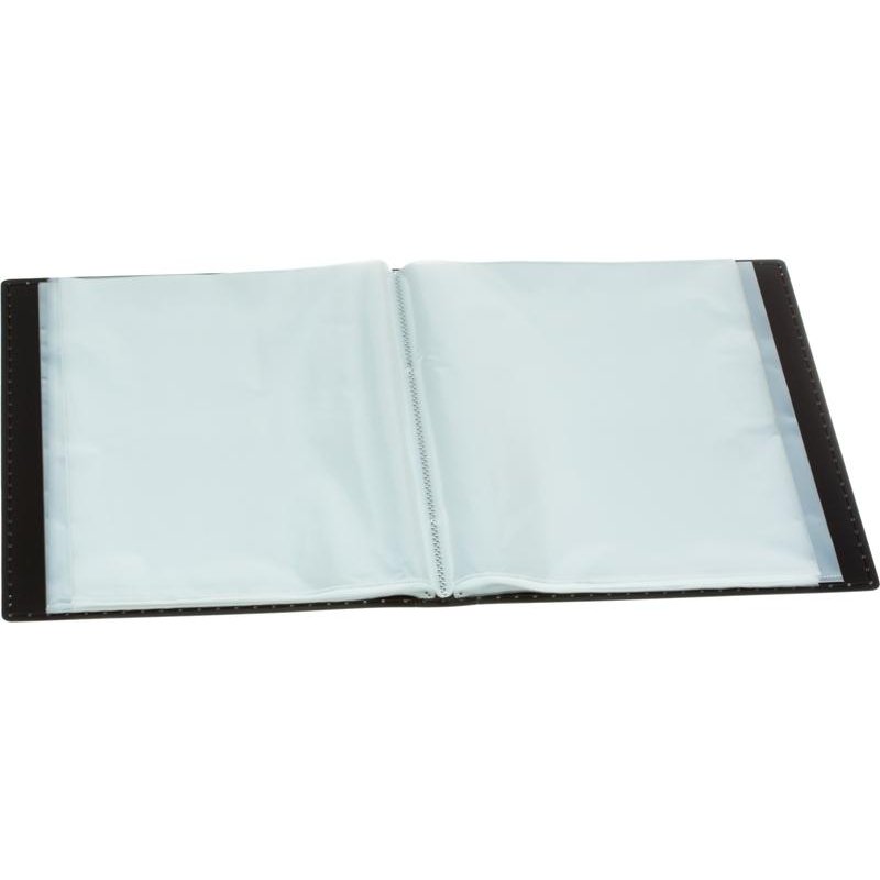 Удобная и практичная файловая папка формата А4 изготовлена из жесткого полипропилена черного цвета толщиной 0.7 мм. Имеет 80 несъемных прозрачных вкладышей, в каждый из которых можно вложить до двух листов. Подходит для хранения и демонстрации документов на презентациях, совещаниях, создания портфолио. Папка с файлами вложена в пластиковый бокс, который позволяет ставить ее на стол. В боксе предусмотрены выемки для легкого извлечения папки. Оба предмета декорированы окантовкой в виде прострочки.