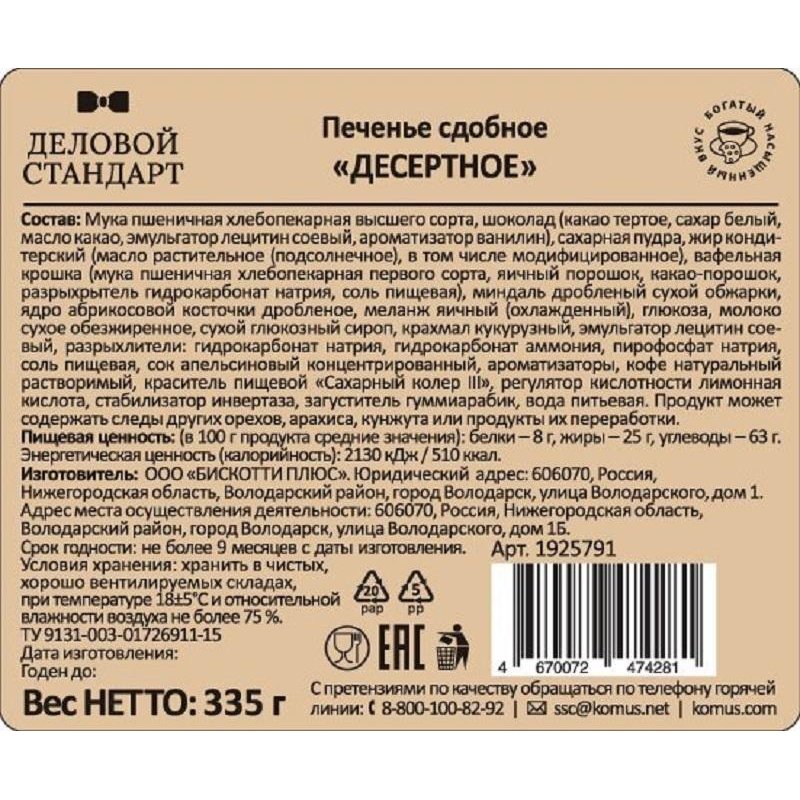 Печенье Деловой Стандарт сдобное Десертное, 335 г. Тесто этого печенья гармонично сочетает в себе дробленый миндаль, шоколадные кусочки и натуральный кофе. Верх печенья покрывается измельченной абрикосовой косточкой, миндалем и посыпается тающим во рту виноградным сахаром. Донышко печенья покрывается шоколадом и бисквитной посыпкой. Состав: мука пшеничная хлебопекарная высшего сорта, шоколад (какао тертое, сахар белый, масло какао, эмульгатор лецитин соевый, ароматизатор ванилин), сахарная пудра, жир кондитерский (масло растительное (подсолнечное), в том числе модифицированное), вафельная крошка (мука пшеничная хлебопекарная первого сорта, яичный порошок, какао-порошок, разрыхлитель гидрокарбонат натрия, соль пищевая), миндаль дробленый сухой обжарки, ядро абрикосовой косточки дробленое, меланж яичный (охлажденный), глюкоза, молоко сухое обезжиренное, сухой глюкозный сироп, крахмал кукурузный, эмульгатор лецитин соевый, разрыхлители: гидрокарбонат натрия, гидрокарбонат аммония, пирофосфат натрия, соль пищевая, сок апельсиновый концентрированный, ароматизаторы, кофе натуральный растворимый, краситель пищевой 'Сахарный колер III', регулятор кислотности лимонная кислота, стабилизатор инвертаза, загуститель гуммиарабик, вода питьевая. Продукт может содержать следы орехов, арахиса, кунжута или продукты их переработки. Пищевая ценность (в 100 г продукта средние значения): белки - 8 г, жиры - 25 г, углеводы - 63 г. Энергетическая ценность (калорийность): 2130 кДж / 510 ккал. Срок годности: 9 месяцев. Условия хранения: хранить в чистых, хорошо вентилируемых складах, при температуре 18+5°С и относительной влажности воздуха не более 75 %.