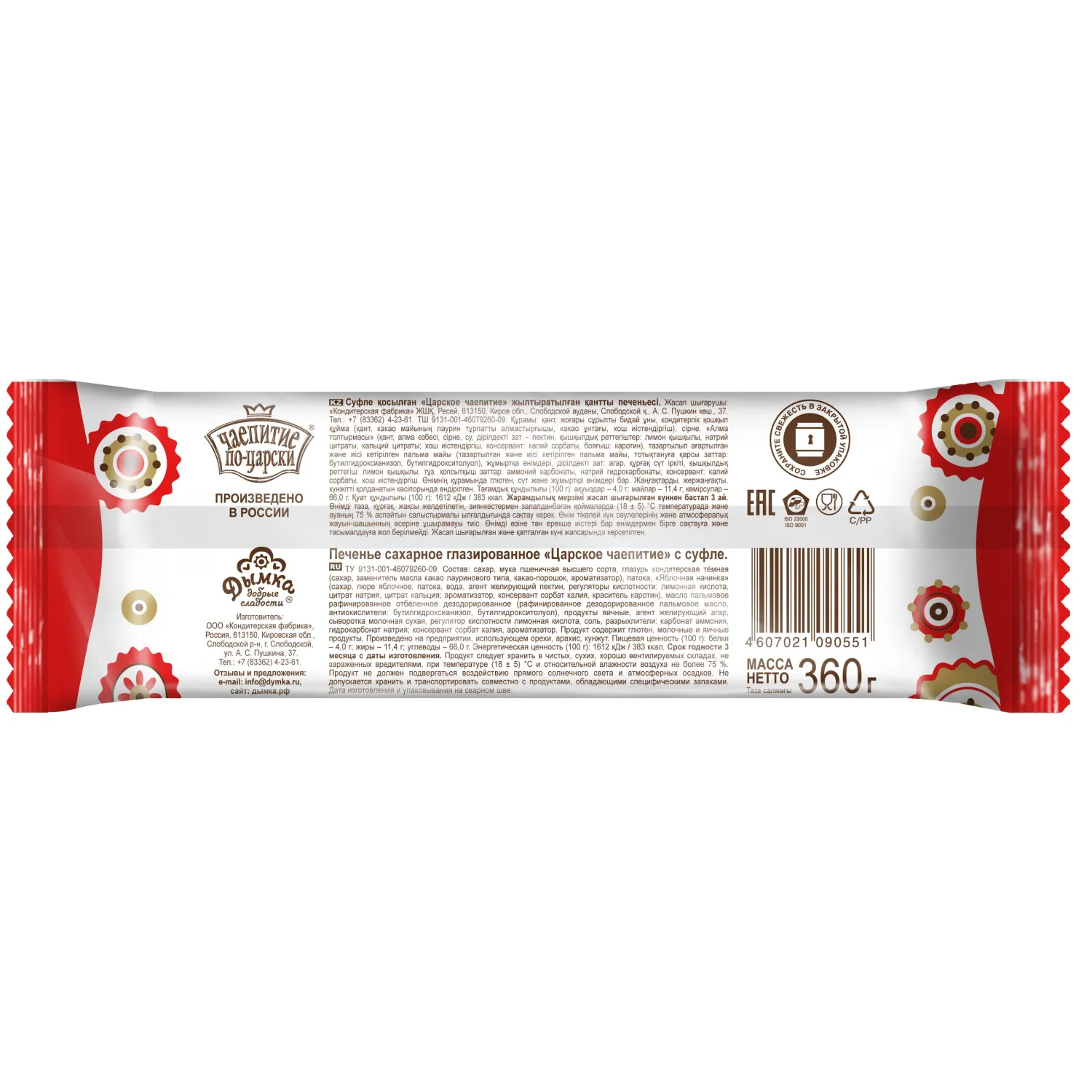 Печенье сахарное в глазури Дымка Царское чаепитие с суфле 360 гВкуснейшее сочетание рассыпчатого сахарного печенья и нежного суфле в кондитерской глазури. Пирожные сделают чаепитие ещё слаще и ещё вкуснее. Состав: сахар, мука пшеничная высшего сорта, глазурь кондитерская тёмная (сахар, заменитель масла какао лауринового типа, какао-порошок, ароматизатор), патока, Яблочная начинка (сахар, пюре яблочное, патока, вода, агент желирующий пектин, регуляторы кислотности: лимонная кислота, цитрат натрия, цитрат кальция; ароматизатор, консервант сорбат калия, краситель каротин), масло пальмовое рафинированное отбеленное дезодорированное (рафинированное дезодорированное пальмовое масло, антиокислители: бутилгидроксианизол, бутилгидрокситолуол), продукты яичные, агент желирующий агар, сыворотка молочная сухая, регулятор кислотности лимонная кислота, соль, разрыхлители: карбонат аммония, гидрокарбонат натрия; консервант сорбат калия, ароматизатор. Пищевая ценность в 100 г: белки 4.0 г; жиры 11.4 г; углеводы 66.0 г. Энергетическая ценность: 1612 кДж (383 ккал). Вес: 360 г. Продукт следует хранить в чистых, сухих, хорошо вентилируемых складах, не заражённых вредителями, при температуре (18+/-5) C и относительной влажности воздуха не более 76%. Срок годности: 3 месяца. Страна производства: Россия.