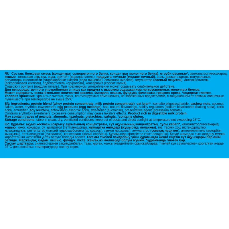 Кокос — источник клетчатки и витамина В6, помогает при профилактике с атеросклероза. Стимулирует работу кишечника, нормализует процессы переваривания пищи и всасывания питательных веществ. Можно беременным и кормящим женщинам, детям, спортсменам, диабетикам, тем, кто на диете. Подходит для употребления после тренировки, во время любого приема пищи, в виде десерта к чаю, кофе и другим напиткам, в т. ч. протеиновым коктейлям. Можно употреблять до, после или во время тренировок, брать с собой в дорогу или в офис. Состав: белки молочные (концентрат сывороточного белка, концентрат молочного белка), отруби овсяные (содержат глютен), изомальтоолигосахарид, кешью, кокосовая стружка, вода, подсластитель (эритрит), продукты яичные (меланж яичный), соль, ароматизаторы натуральные, регуляторы кислотности (гидрокарбонат натрия (сода пищевая), лимонная кислота), эмульгатор (соевый лецитин), антиокислитель (аскорбиновая кислота), подсластитель (сукралоза), консервант (сорбат калия). Содержит глютен. Содержит эритрит, при чрезмерном употреблении может оказывать слабительное действие. Может содержать незначительное количество арахиса, миндаля, кешью, фундука, фисташки, грецкого ореха. Пищевая ценность: белки — 25 г, жиры — 12.3 г, углеводы — 8.3 г. Энергетическая ценность: 269 ккал. Срок годности: 12 месяцев. Вес: 40 г. Тип упаковки: мягкая. Хранить в чистых, сухих, вентилируемых помещениях, не зараженных вредителями, в защищенном от прямых солнечных лучей месте, при температуре не выше 25°С. Страна производства: Россия. ТУ 10.72.12-006-06585958-2018