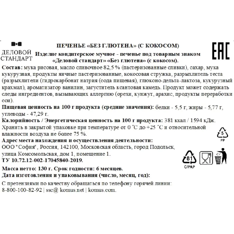 Печенье сдобное Деловой Стандарт кокосовое без глютена 130 гНовый уровень наслаждения сдобное кокосовое печенье без глютена в удобном стакане! Нежный вкус кокоса и мягкая текстура создают идеальный перекус для тех, кто ценит качество и заботится о здоровье. Идеально для перекуса на работе, дома или в дороге. Берите с собой и наслаждайтесь вкусом, который делает каждый момент особенным! Состав: мука рисовая, масло сливочное 82.5% (пастеризованные сливки), сахар, мука кукурузная, продукты яичные пастеризованные, кокосовая стружка, разрыхлитель теста (разрыхлители (гидрокарбонат натрия (сода пищевая), глюконо-дельта-лактоза, кукурузный крахмал), ароматизатор ванилин, загуститель ксантановая камедь. Продукт может содержать следы ингредиентов, вызывающих аллергию (орехи, кунжут, арахис, продукты переработки сои). Пищевая ценность на 100 г продукта (средние значения): белки 5.5 г, жиры 5.77 г, углеводы 47.29 г. Калорийность / Энергетическая ценность на 100 г продукта: 381 ккал / 1594 кДж. Срок годности: 6 месяцев. Хранить в закрытой упаковке при температуре от 0C до +25C и относительной влажности воздуха не более 75%.