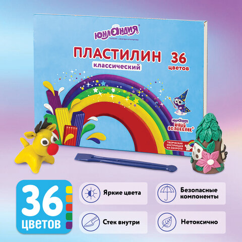Удивительное разнообразие 36 цветов позволит ребенку создать поистине уникальную поделку, миниатюрную скульптуру или красочную картину. Масса набора - 720 г. Со стеком. В него входит 36 брусков по 20 г различных цветов: белый, желтый, ярко-красный, зеленый, синий, черный, сиреневый, коричневый, оранжевый, розовый, голубой, светло-зеленый, ярко-оранжевый, желто-зеленый, серый, красно-коричневый, фиолетовый, светло-сиреневый, лимонный, персиковый, светло-персиковый, малиновый, травянистый, охра, сливовый, аквамарин, мох, светлая охра, кирпичный, светло-серый, ярко-розовый, салатовый, алый, клубничный, терракотовый, изумрудный. Пластилин ЮНЛАНДИЯ обладает высоким качеством, прекрасными пластичными свойствами и мягкостью, легко принимает нужную форму. Не токсичен, не прилипает к рукам, безопасен для детей. Производится из белой глины (каолина), мела, парафина и пигментов. Пластилин упакован в красочную картонную коробку. Предназначен для детей старше 3-х лет. Ребенок создаст свой шедевр вместе с пластилином Юнландия и воплотит заветные мечты в реальность. Приобретайте пластилин ЮНЛАНДИЯ «ЮНЫЙ ВОЛШЕБНИК» в нашем интернет-магазине!