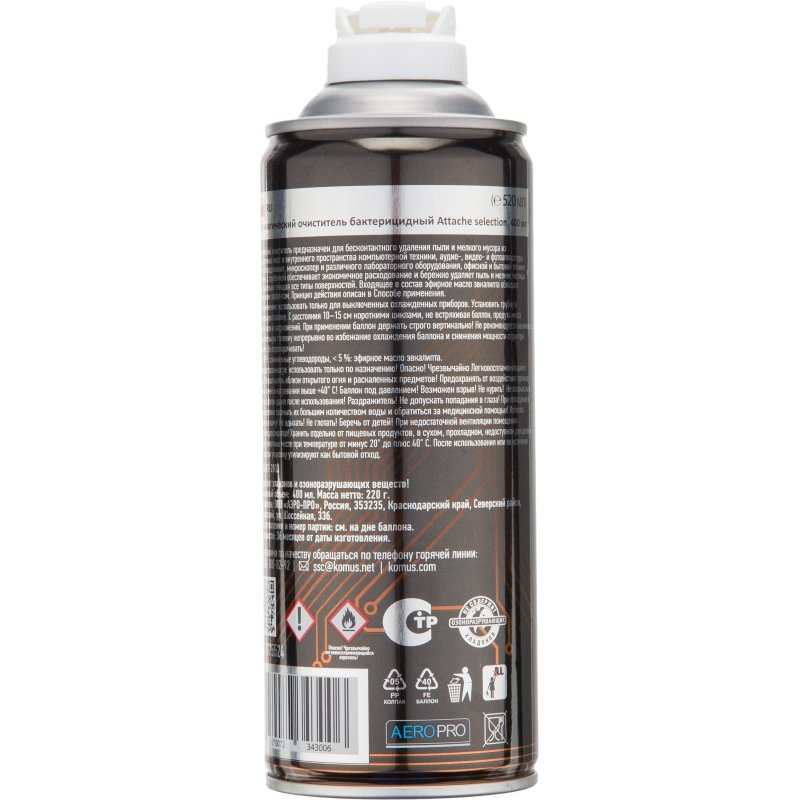 Пневматический очиститель предназначен для бесконтактного удаления пыли и мелкого мусора из труднодоступных мест и внутреннего пространства компьютерной техники, аудио-, видео- и фотоаппаратуры, швейного оборудования, микроскопов и различного лабораторного оборудования, офисной и бытовой техники. Распылитель с трубочкой обеспечивает экономичное расходование и бережно удаляет пыль и мелкие частицы мусора, тщательно очищая все типы поверхностей. Входящее в состав эфирное масло эвкалипта обладает бактерицидным эффектом. Номинальный объем: 400 мл. Масса нето: 220 г. Способ применения: Использовать только для выключенных охлажденных приборов. Установить трубку в распылительную головку. С расстояния 10-15 см короткими циклами, не встряхивая баллон, продуть места скопления пыли и загрязнений. При применении баллон держать строго вертикально! Не рекомендуется нажимать на распылительную головку непрерывно во избежание охлождения баллона и снижения мощности струи при распылении Состав: >30%: сжиженные углеводороды, < 5%: эфирное масло эвкалипта. Меры предосторожности: Использовать только по назначению! Опасно! Чрезвычайно Легковоспламеняющийся аэрозоль! Не распылять вблизи открытого огня и раскаленных предметов! Предохранять от воздействия прямых солнечных лучей и нагревания выше +40°C! Баллон под давлением! Возможен взрыв! Не курить! Не вскрывать и не сжигать баллон даже после использования! Раздражитель! Не допускать попадания в глаза! При попадании в глаза немедленно промыть их большим количеством воды и обратиться за медицинской помощью! Избегать попадания на кожу! Не вдыхать! Не глотать! Беречь от детей! При недостаточной вентиляции помещения использовать респиратор! Хранить отдельно от пищевых продуктов, в сухом, прохладном, недоступном для детей и домашних животных месте при температуре от минус 20 до плюс 40 °С. После использования или по истечении срока годности упаковку утилизируют как бытовой отход.