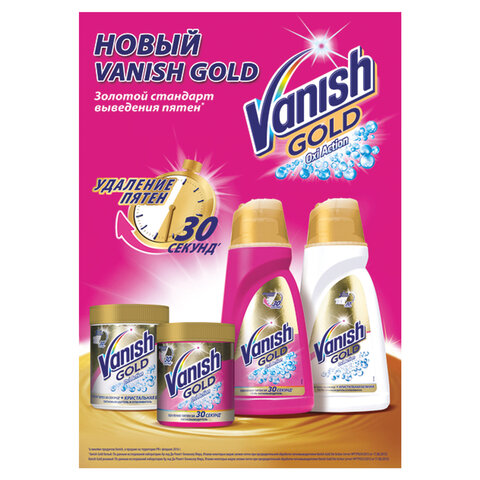 Пятновыводитель для тканей Гель Vanish Gold Oxi ActionНазначение: Средство предназначено для удаления пятен с белых и цветных тканей. Всегда следовать рекомендациям производителя по стирке изделия. Для цветных тканей рекомендуется предварительно проверять прочность окрашивания на незаметном участке. После стирки и обработки тканей средством сушите вдали от источников тепла и солнечного света. Используйте теплую воду для предварительной обработки тканей средством. Не использовать, если рекомендована сухая чистка. Не оставляйте предварительно обработанные или замоченные вещи под прямыми солнечными лучами или у источников тепла. Не допускать высыхания средства на ткани (не оставлять более чем на 10 минут). Способ применения: — Предварительная обработка:Нанесите на пятно с помощью дозатора около 20 мл средства. Потрите пятно. Наполните мерную крышку согласно инструкции и положите в стиральную машину. — Замачивание:Разведите 60 мл средства в 4 л воды при температуре не выше 40°C.  Оставить замачиваться цветное белье — не более чем на 1 час, белое белье — не более чем на 6 часов. После замачивания стирайте как обычно или тщательно прополощите. Для лучшего результата перед полосканием потрите. — Стирка:Добавьте к вашему стиральному порошку (на 10 л воды):• Для въевшихся и засохших пятен — 120 мл средства;• Для повседневных пятен — 60 мл средства. Положите мерную крышку в стиральную машину вместе с бельем. Добавьте стиральный порошок. Меры предосторожности: Беречь от детей. Не допускать попадания в глаза, на кожу или на одежду. При попадании в глаза тщательно промыть водой в течение нескольких минут. Людям с чувствительной кожей рекомендуется использовать резиновые перчатки. Состав: 5%, но 15%: кислородосодержащий отбеливатель, анионные и неионогенные ПАВ; 5%: оптический отбеливатель, ароматизатор, консервант, фосфонаты, цитронеллол, гексилциннамаль. Условия хранения: Предохранять от воздействия прямых солнечных лучей и нагревания выше 40°C. Срок годности: 2 года с даты производства.