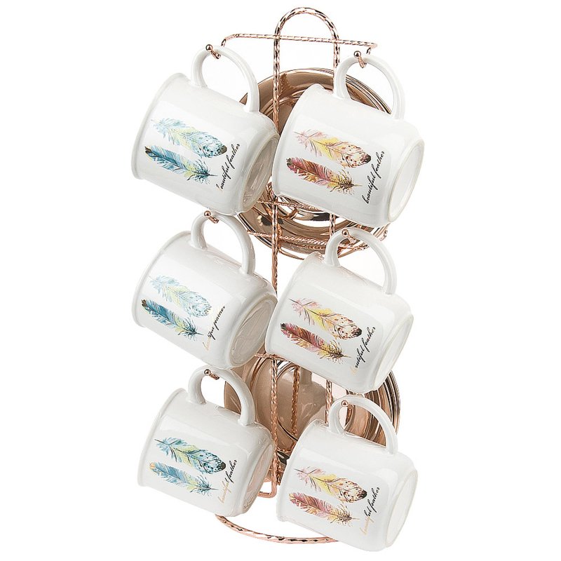 Чайный набор из 12 предметов на 6 персон на металлической подставке 'Перья'. Объем чашек: 250 мл. Комплектация: чашка (6 шт. ) диаметр 7.8 см, высота 8 см, блюдце (6 шт. ) диаметр 13.5 см, подставка (1 шт. ). Размер набора: 18×14x37см. Размер товара в упаковке: 19×15x38 см. Материал: керамика. Рекомендации по использованию: не рекомендуется использовать в микроволновых печах, а также мыть в посудомоечной машине.