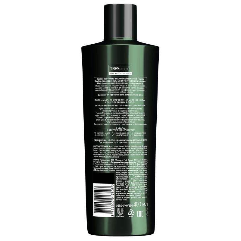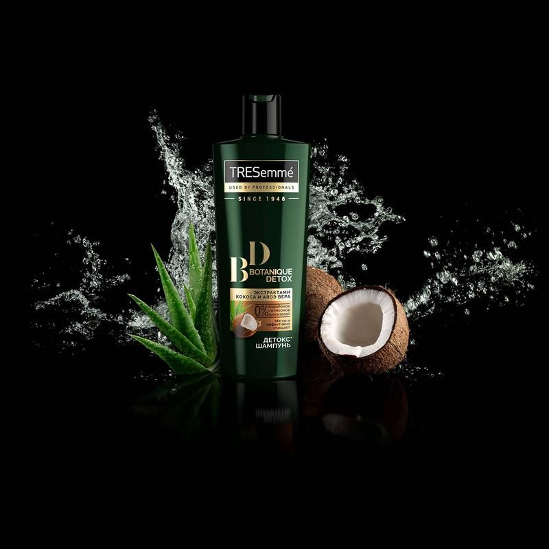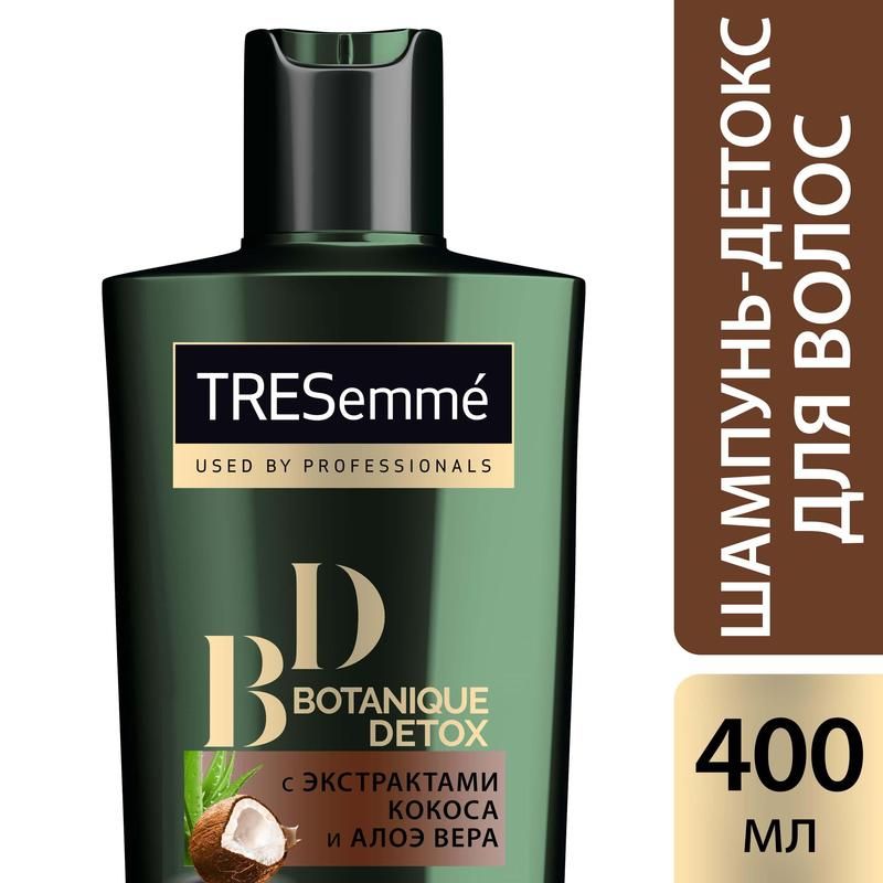 Шампунь-детокс Tresemme Botanique Detox (400 мл). Формула с кокосом и алоэ вера наполняет волосы питательными компонентами. Результат: волосы выглядят здоровыми и блестящими. Детокс в пределах рогового слоя кожи и кутикулы волос. Без силиконов, парабенов и красителей. Только бережное и эффективное очищение волос.