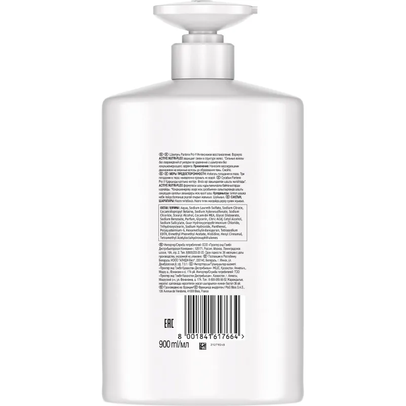 Шампунь Pantene Pro-V Интенсивное восстановление для окрашенных/тонких и повреждённых волос 900 млОткройте для себя шампунь Pantene Интенсивное Восстановление, идеальный источник питания волос, обеспечивающий их защиту. Мягкая формула с Pro-V и технологией Active Nutri-Plex очищает волосы, наполняя их необходимыми питательными веществами. При использовании в комплексе с нашим бальзамом-ополаскивателем помогает восстановить волосы, избавив от таких признаков повреждений, как отсутствие гладкости и блеска, и одновременно укрепляя волосы изнутри. Протестировано Швейцарским Институтом Витаминов. Состав: aqua, sodium laureth sulfate, sodium citrate, cocamidopropyl betaine, sodium xylenesulfonate, sodium chloride, stearyl alcohol, cocamide mea, glycol distearate, sodium benzoate, parfum, glycerin, citric acid, cetyl alcohol, sodium salicylate, guar hydroxypropyltrimonium chloride, trihydroxystearin, sodium hydroxide, panthenol, polyquaternium-6, hexamethylindanopyran, tetrasodium edta, dimethyl phenethyl acetate, histidine, hexyl cinnamal, tetramethyl acetyloctahydronaphthalenes.