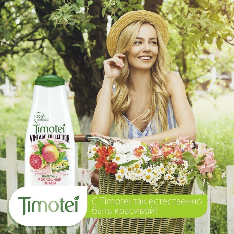 Бренд Timotei начал выпускать свою продукцию в 80-х годах прошлого века с одной целью: чтобы создавать средства с натуральными ингредиентами для ухода за волосами, эффективные и полезные. Каждый день Ваши волосы, подвергаясь воздействию вредных веществ, теряют свой естественный блеск. Мы уверены, что природа — лучший источник красоты волос. Поэтому специалисты Timotei много работают и раскрывают секреты природы, чтобы создавать средства с натуральными ингредиентами для ухода за волосами, питающие и приносящие отличные результаты. Timotei всегда был брендом средств по уходу за волосами, черпающим вдохновение у природы. Всё началось с одного-единственного шампуня с натуральными экстрактами трав — такого мягкого, что им можно было пользоваться каждый день. Это был наш первый успех. Многое изменилось с тех пор, но одно осталось неизменным — мы по-прежнему верим в силу природы, в то, что средства для волос Timotei — прекрасный способ ухаживать за ними и сегодня, и завтра. Ведь, в конце концов, сила природы безгранична, и мы можем получить от неё практически всё, что нам нужно, именно поэтому мы разрабатываем рецепты, содержащие натуральные ингредиенты, собранные со всей планеты, — чтобы наши средства сделали Ваши волосы еще более красивыми. Результат: Сила природы для красоты волос. Средства по уходу за волосами Timotei содержат натуральные ингредиенты. Шампунь Timotei Роскошный объем придаст Вашим волосам головокружительный, стойкий объем и здоровый вид. Формула, обогащенная экстрактами семян гуараны и розового грейпфрута, обладает легкой текстурой, не утяжеляет волосы, придает им удивительную мягкость и объем до 48 часов.