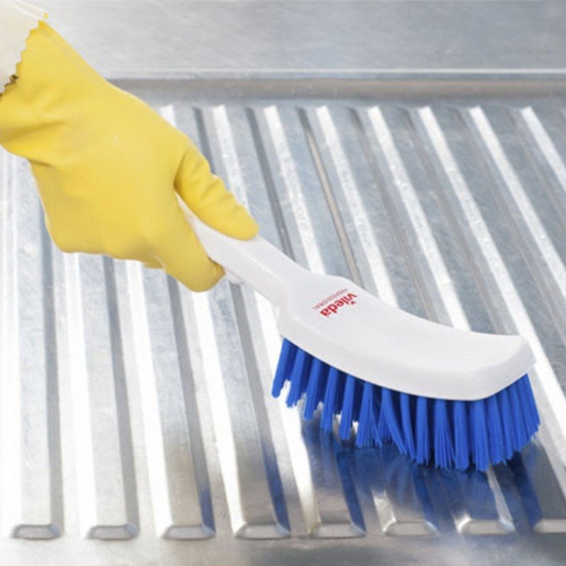 Щетка Vileda гигиеническая ручная. Особенности:• Удобная короткая ручка для универсального использования, в том числе на кухне• Сильный корпус щетки в сочетании с высококачественной PBT-щетиной — для эффективной и гигиенической очистки• Щетина из PBT-материала: превосходное восстановление после сгибания и высокая сопротивляемость к широкому диапазону химических веществ• Скобки из прочного материала — нейзильбера — для обеспечения долговечности, гигиены, не подвержены ржавчине• Возможно автоклавирование при температуре до +134 °С• Диаметр жёсткой щетины — 0.5 мм