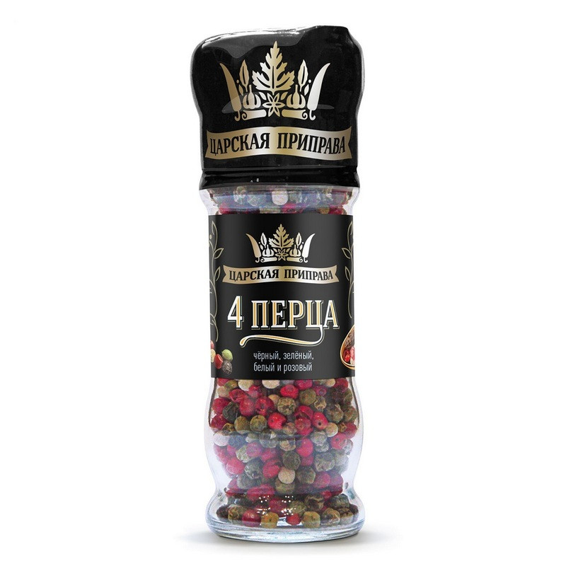 Четыре вида перцев, которые слились в одну смесь, являются дополнением ко многим блюдам. Каждый из перцев играет свою роль и ярко проявляет свои качества. Основной аромат этой приправе задает розовый перец. Нотки жгучести и остроты придают приправе черный и белый перцы горошком. Таким образом, пряная смесь имеет два уровня остроты: первый, насыщенный — это заслуга черного перца, а второй уровень, более нежный — белого. И, наконец, последним компонентом приправы «4 перца» является зеленый перец. Оттенок, которым он делится со смесью, идеально сочетается с маринадами и соусами. Состав: Перец черный горошком, перец белый горошком, перец зеленый горошком, перец розовый горошком. Область применения: Использовать для приготовления салатов, закусок, супов, вторых обеденных блюд.