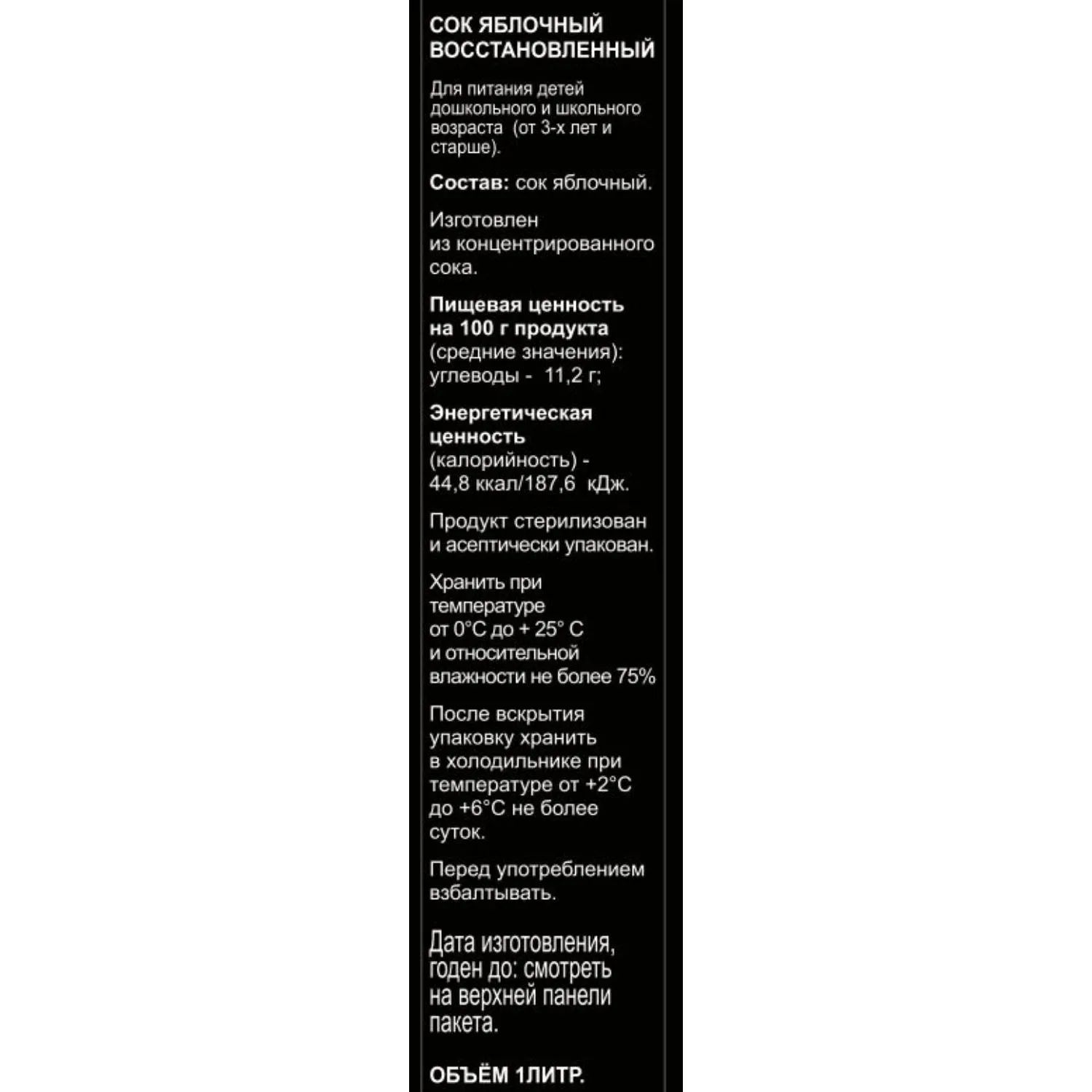 Сок яблочный 100%, без сахара, консервантов, красителей. Сочетание насыщенного вкуса спелого яблока. Состав: сок яблочный. Энергетическая ценность (калорийность): 187.6 кДж/44.8 ккал. Пищевая ценность: углеводы 11.2 г. Хранить при температуре от 0 до +25 С и относительной влажностью не более 75%. После вскрытия упаковки хранить в холодильнике при температуре от +2 до +6 С не более суток. Внешний вид и/или характеристики товара могут быть изменены производителем в соответствии с производственным процессом.