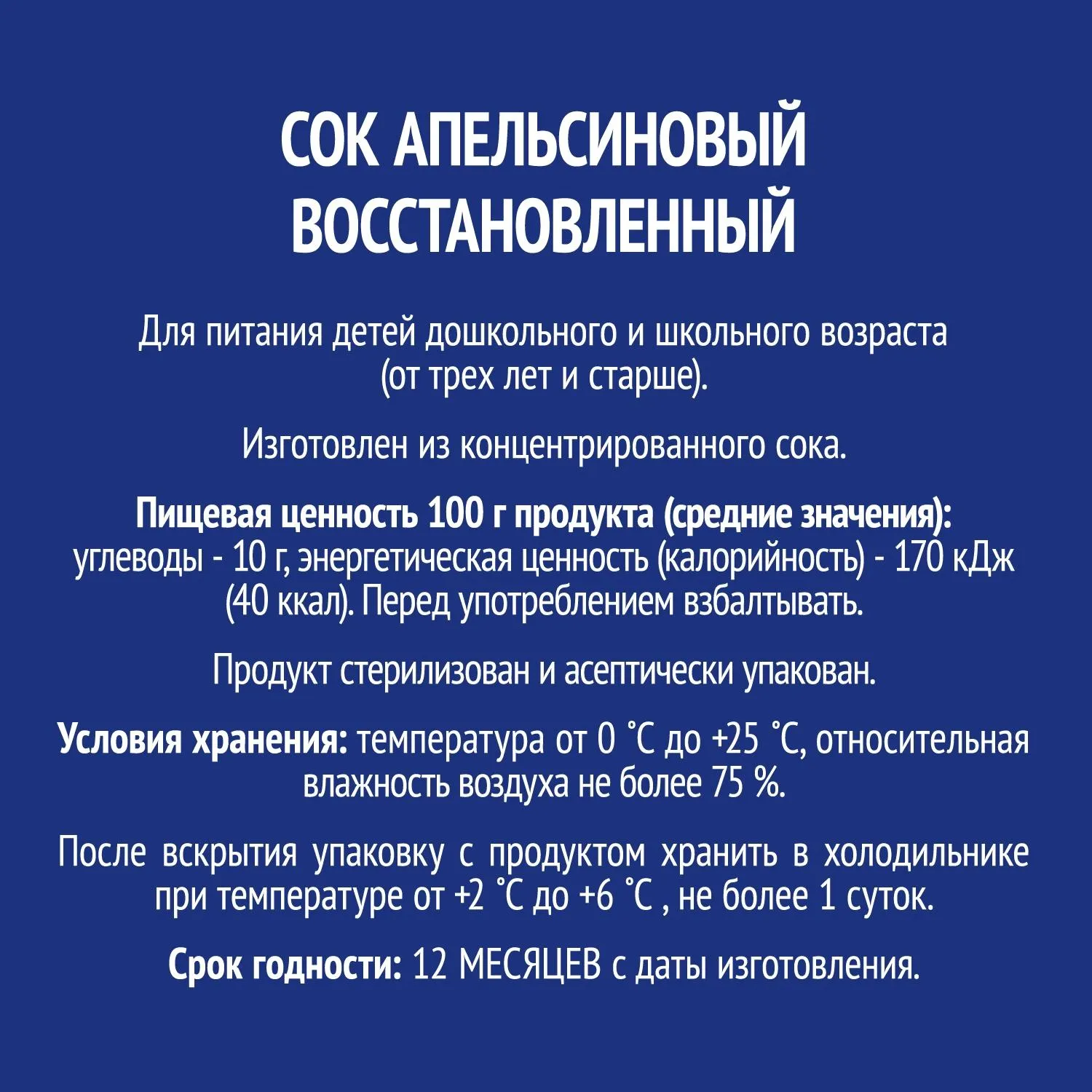 Сок Вико апельсиновый 0.2 лНатуральный апельсиновый сок Вико буквально излучает яркость и энергию отборных апельсинов. Премиальное качество сока подчёркивается его осветлёнными тонами, приятной текстурой и гармоничным вкусом. Состав: 100% апельсиновый сок. Пищевая ценность на 100 г: углеводы 10 г. Энергетическая ценность: 170 кДж/40 ккал. Условия хранения: хранить при температуре от 0 С до +25 С, с относительной влажностью воздуха не более 75 %. После вскрытия упаковку с продуктом хранить в холодильнике при температуре от +2 С до +6 С, не более 1 суток. Для питания детей школьного и дошкольного возраста от 3-х лет. Внешний вид и/или характеристики товара могут быть изменены производителем в соответствии с производственным процессом.