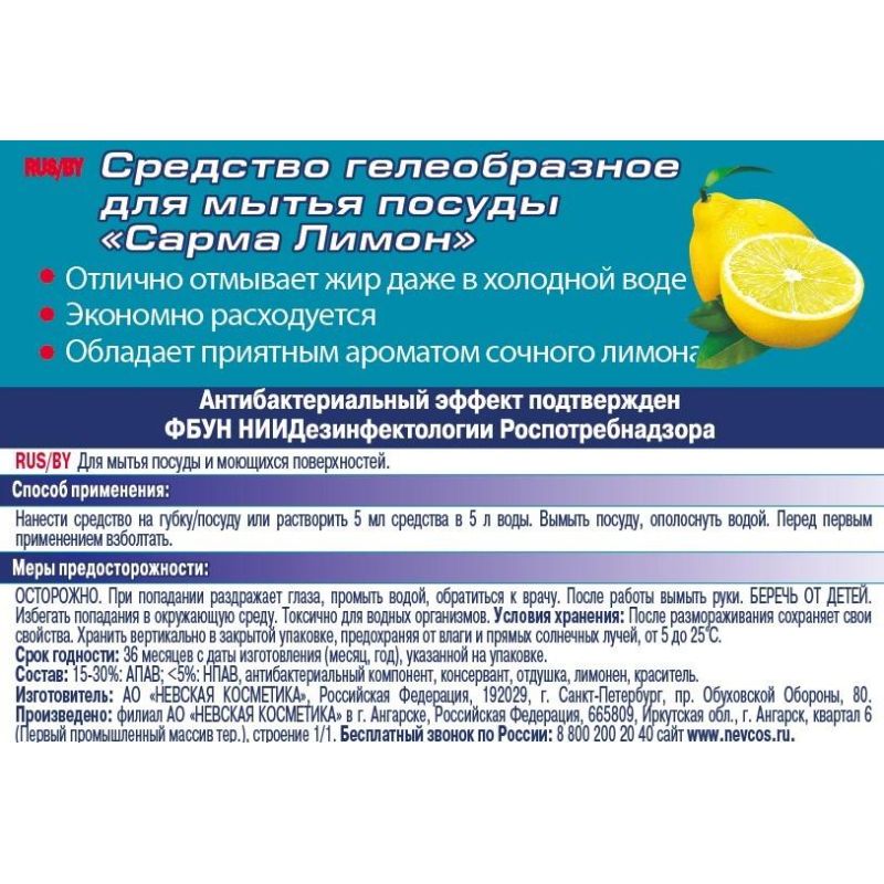 Средство для мытья посуды Sarma Лимон 500 мл. Назначение: Гель для мытья посуды с густой формулой безупречно моет посуду, эффективно расщепляет жир даже в холодной воде, экономно расходуется. Он создает обильную густую пену, при этом легко смывается с посуды, оставляя ее скрипящей чистой! Гель обладает свежим ароматом лимона. Антибактериальный эффект подтвержден ФБУН НИИ Дезинфектологии Роспотребнадзора. Способ применения: Нанести средство на губку/посуду или растворить 5 мл средства в 5 л воды. Вымыть посуду, ополоснуть чистой водой. Меры предосторожности: ОСТОРОЖНО. При попадании раздражает глаза, промыть водой, обратиться к врачу. После работы вымыть руки. БЕРЕЧЬ ОТ ДЕТЕЙ. Избегать попадания в окружающую среду. Токсично для водных организмов. Состав: 15-30%: АПАВ;