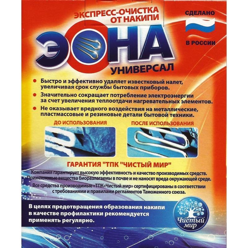 Средство для удаления накипи «Эона Универсал» порошок, 250 г. НазначениеЭкспресс-очиститель накипи «Эона Универсал» подходит для стиральных и посудомоечных машин, кофеварок, чайников, утюгов и других водонагревательных приборов. Быстро и эффективно удаляет известковый налет, продлевая срок службы бытовых приборов. Сокращает потребление электроэнергии за счет увеличенной теплоотдачи чистых нагревательных элементов. Не оказывает вредного воздействия на металлические, пластмассовые и резиновые детали бытовой техники. Способ примененияДля стиральных машин: удалить из машины белье. Высыпать содержимое непосредственно в стиральный барабан. Включить программу стирки белья при 60 °C (без предварительной стирки) и дать машине полностью ее выполнить. Для посудомоечных машин: удалить из машины посуду. Высыпать содержимое пакета непосредственно в посудомоечную камеру. Включить программу мойки посуды и дать машине полностью ее выполнить. Для чайников: залить воду и добавить 1/3 содержимого пакета, прокипятить и дать постоять 30 минут. Перед последующим использованием тщательно промыть горячей водой. Для кофеварок: залить в бачок литр воды. Добавить 1/3 средства и перемешать полученный раствор. Следовать указаниям, приведенным в инструкции кофеварки. После завершения процесса удаления накипи, сполосните бачок водой и произведите ополаскивание, как описано в инструкции. Меры предосторожностиВнимание! При попадании в глаза и на кожу, промыть водой. Хранить в местах, недоступных для детей. СоставОрганические пищевые кислоты, гексаметафосфат натрия, специальные пищевые смеси солей щелочных металлов. ГОСТ/ТУТУ 2381-002-85625150-2008. Условия храненияХранить при температуре от −5 до +40 °C и относительной влажности воздуха не более 95%, предостерегать от попадания влаги. Срок годности3 года (указан на упаковке).