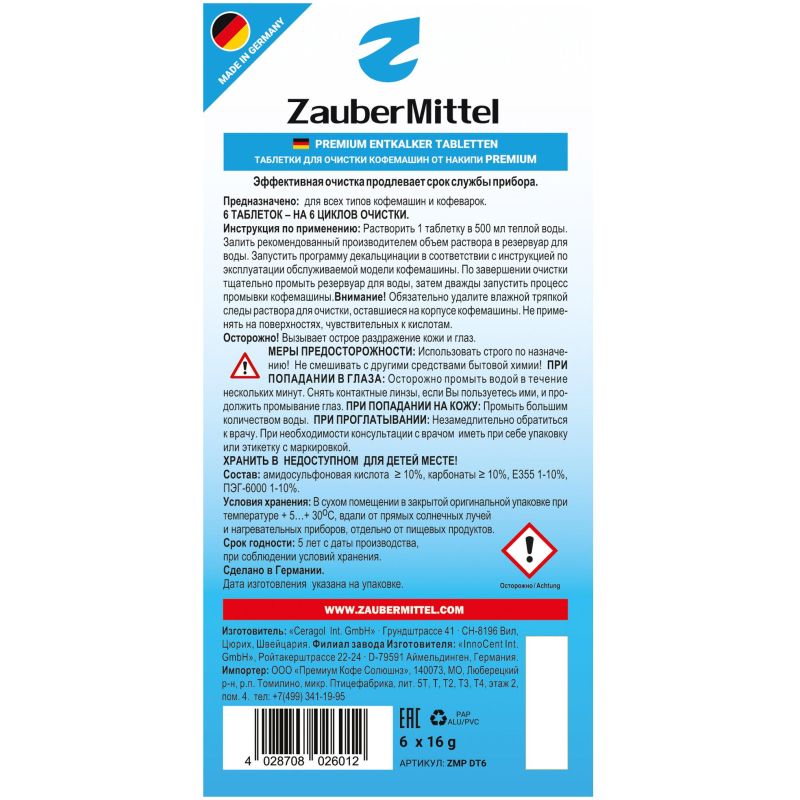 Таблетки для очистки от накипи ZauberMittel ZMP DT6 Внешний вид и/или характеристики товара могут быть изменены производителем в соответствии с производственным процессом.