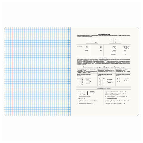 Тетрадь по информатике формата А5 (165×202 мм) содержит 48 листов, изготовленных из высококачественной офсетной бумаги 100% белизны, плотностью 60 г/м2. Листы соединены скобами. Линовка блока - в клетку, красные поля. Обложка выполнена из мелованного картона плотностью 190 г/м2 в тематике соответствующего предмета. Благодаря глянцевому лаку краски на изображении выглядят более яркими и насыщенными. В справочном материале для учащихся собраны основные подсказки по школьному предмету.