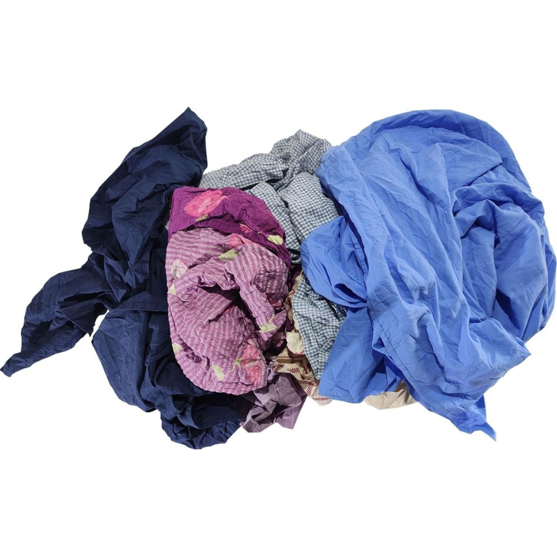 Ветошь постельная цветная 10 кг. Переработанное цветное постельное белье секонд-хенд (пододеяльники, простыни, наволочки, наматрасники из сатина, бязи, ситца и аналогичных гладких безворсовых тканей). Крупные лоскуты неправильной формы, с минимальным количеством швов. Простыни - наиболее качественная и универсальная ветошь в нашем ассортименте, является более дешевой альтернативой технической салфетке и практически не уступает ей по качеству. Продукт отлично впитывает воду, краску, масло и нефтепродукты, применяется в большинстве отраслей промышленности, не оставляет ворса. Не содержит фурнитуру. ГОСТ 4643-75. Размер лоскута: ширина 40-70 см, длина 60-80 см. Состав ткани: 80% хлопок, 20% синтетика Диапазон плотности: 80-200 г/м. Вес: 10 кг.