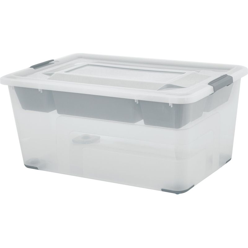 Универсальный контейнер для хранения с лоткоv Bergen 40 литров подходит для хранения разнообразных мелочей в доме (рукоделия, проводов, детских мелких игрушек и канцелярии), а также для перевозки вещей при переезде. Прозрачный корпус и крышка позволяют видеть содержимое, что удобно для хранения в закрытых гардеробных. Ящики прекрасно штабелируются и устойчиво держатся друг на друге благодаря специальной форме крышки и дна. Надежный и практичный благодаря толстым стенкам. Защищает от загрязнения и пыли содержимое благодаря крышке. Изготовлен из эко-пластика и подходит для контакта с пищей. Надежные замки-защелки позволяют сохранить содержимое ящика. Лоток для хранения, входящий в состав ящика имеет эргономичную ручку и деление на отсеки. Лоток экологичен, т. к. изготовлен из переработанного материала. Удобные колесики на дне позволяют легко перемещать ящик. Можно сменить положение колесиков, чтобы ящик двигался либо по его длинной стороне, либо по короткой для удобства помещения его под кровать, в шкаф.