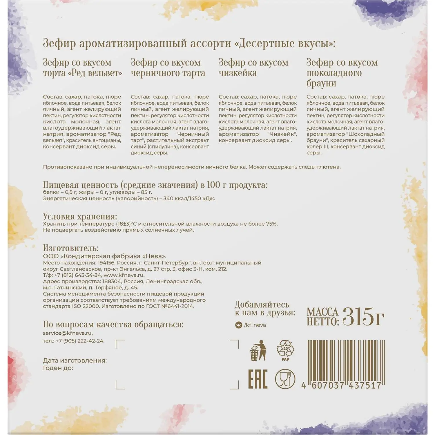 Зефир Doni Zefironi Нева ассорти 315 гЗефир Doni Zefironi Десертные вкусы это кондитерские хиты в зефирном исполнении. Попробуйте нежнейший зефир со вкусами шоколадного брауни, черничного тарта, торта Red Velvet и чизкейка. Зефир Doni Zefironi изготовлен по ГОСТу из натурального яблочного пюре и белка, по ГОСТу, 0% жиров. Состав:Зефир со вкусом торта Ред вельвет: сахар, патока, пюре яблочное, вода питьевая, белок яичный, агент желирующий пектин, регулятор кислотности кислота молочная, агент влагоудерживающий лактат натрия, ароматизатор Ред вельвет, краситель антоцианы, консервант диоксид серы. Зефир со вкусом черничного тарта: сахар, патока, пюре яблочное, вода питьевая, белок яичный, агент желирующий пектин, регулятор кислотности кислота молочная, агент влагоудерживающий лактат натрия, ароматизатор Черничный тарт, растительный экстракт синий (спирулина), консервант диоксид серы. Зефир со вкусом чизкейка: сахар, патока, пюре яблочное, вода питьевая, белок яичный, агент желирующий пектин, регулятор кислотности кислота молочная, агент влагоудерживающий лактат натрия, ароматизатор Чизкейк, консервант диоксид серы. Зефир со вкусом шоколадного брауни: сахар, патока, пюре яблочное, вода питьевая, белок яичный, агент желирующий пектин, регулятор кислотности кислота молочная, агент влагоудерживающий лактат натрия, ароматизатор Шоколадный брауни, краситель сахарный колер III, консервант диоксид серы. Пищевая ценность: белки 0.5 г, жиры 0 г, углеводы 85 г. Энергетическая ценность: 340 ккал / 1450 кДж. Хранить при температуре (183)С и относительной влажности воздуха не более 75%. Не подвергать воздействию прямых солнечных лучей. Противопоказано при индивидуальной непереносимости яичного белка. Может содержать следы глютена. Внешний вид и/или характеристики товара могут быть изменены производителем в соответствии с производственным процессом.